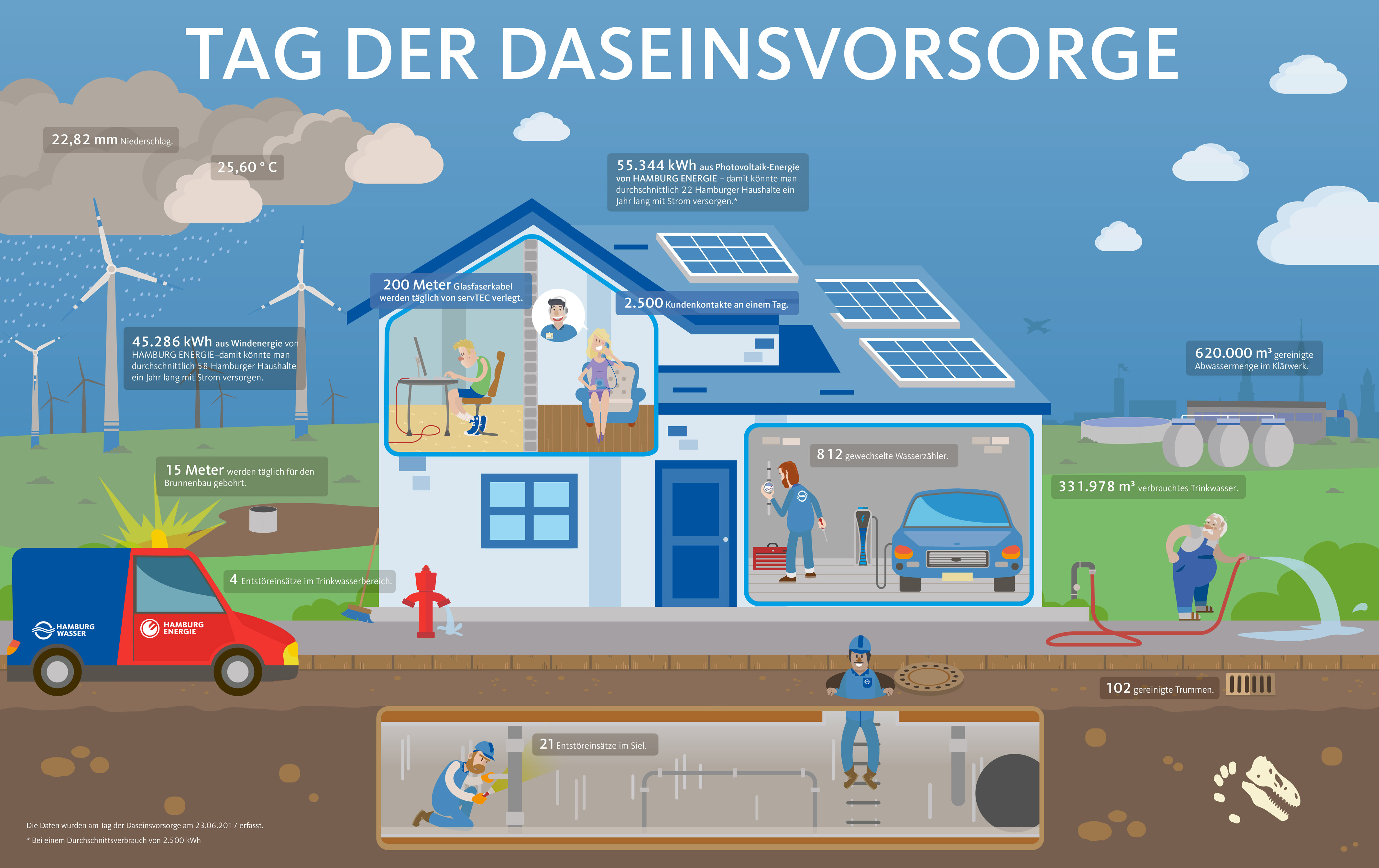 Innerhalb des Tages wurden über 800 Wasserzähler gewechselt und gab es rund 2500 Kundenkontakte. Im Labor wurden im Trinkwasser 2.288 Parameter analysiert und 15 Meter für den Brunnenbau gebohrt. Binnen des genannten Tages gab es 21 Sieleinsätze und es wurden 102 Straßenabläufe gereinigt. Die Konzerntochter HAMBURG ENERGIE hat an dem Tag 248.664 kWh Strom aus eigenen Anlagen erzeugt, damit können umgerechnet 145 Haushalte ein Jahr lang mit Strom versorgt werden.