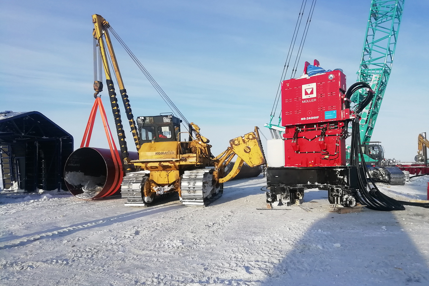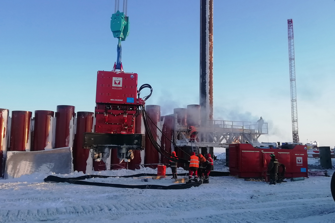 Angesichts arktischer Temperaturen war dies besonders wichtig, denn die darin enthaltenen Vorwärmeinrichtungen für das Hydrauliköl und das Kühlwasser des Dieselmotors schonen die Anlagenkomponenten und erhöhen so deren Betriebsbereitschaft und Lebensdauer. Über jeweils 120 Meter lange Schlauchleitungen wurde der Volumenstrom an die Vibrationsrammen weitergeleitet. Auf diese Weise war es möglich, Stahlrohre in Tiefen zwischen 25 und 60 Metern in den Boden einzubringen. Hierbei sorgten jeweils vier MS-U 180 GP-Spannvorrichtungen – montiert an einer Konsole MS-KX 320 – für eine schwingungsfreie Verbindung der Rohre mit der Vibrationseinheit.