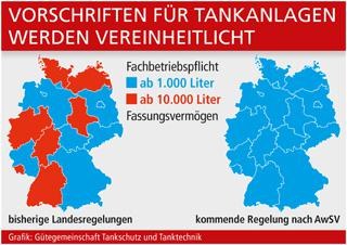 In den "Verordnungen über Anlagen zum Umgang mit wassergefährdenden Stoffen und über Fachbetriebe" (Landes-VAwS) hat bisher jedes der 16 Bundesländer seine eigenen Regelungen zu Prüfpflichten, Fachbetrieben oder technischen Ausführungen erlassen. So besteht nach Angaben des Bundesverbandes Behälterschutz e. V. (Freiburg) derzeit in einigen Bundesländern eine Fachbetriebspflicht für Arbeiten an Heizöltanks bereits ab 1.000 Liter Fassungsvermögen, während es anderswo 10.000 Liter sind. Diese komplizierte Rechtslage inklusive diverser Widersprüche und Gesetzeslücken wird durch eine bundeseinheitliche Regelung zum Umgang mit wassergefährdenden Stoffen (AwSV) vereinheitlicht, die voraussichtlich im Laufe des Jahres 2015 in Kraft tritt.