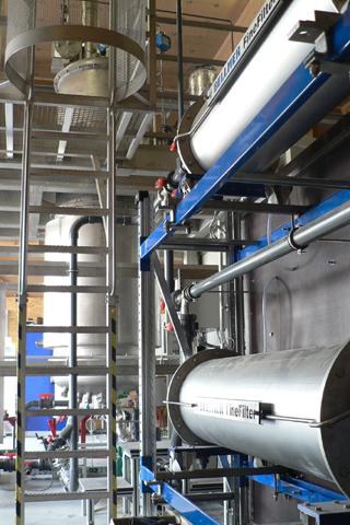 Über einen durchmischten Vorlagebehälter wird hieraus die derzeit für 50 Einwohner ausgelegte, problemlos erweiterbare biologische Abwasserreinigungsanlage mit integrierter Mikrofiltration gefüttert: Diese besteht aus einem etwa 2,5 Kubikmeter fassenden Bioreaktor mit einer nachgeschalteten Membranfilterstufe aus zwei Rotationsscheibenfiltern. "Wir betreiben den Bioreaktor anaerob, das heißt unter Ausschluss von Luftsauerstoff und bei hiesigen niedrigen Tempera-turen. Das ist eine Weltneuheit, denn herkömmliche Kläranlagen nutzen aerobe Biologie für die Endreinigung des Abwassers" sagt Trösch. "Anaerobe Mikroorganismen bilden weniger Biomasse als aerobe und produzieren Biogas, ein Gemisch aus Methan und Kohlendioxid. So entsteht praktisch kein Schlamm aber Biogas als regenerativer Energieträger, der die Anlage kostensparend mit Strom und Wärme versorgt" hebt Trösch die Vorzüge des neuen Verfahrens hervor. Überschussstrom kann in das Versorgungsnetz eingespeist werden. Das entstehende Biogas wird gleichzeitig zur Durchmischung des Bioreaktors verwendet. Die anaerobe Betriebsführung bei niedrigen Temperaturen hat gegenüber aeroben Verfahren zudem den Vorteil, dass Energiekosten für die Belüftung entfallen. Der Filter zieht nicht nur gereinigtes Wasser ab, sondern sorgt auch dafür, dass die Bakterien im Reaktor zurückgehalten werden und sich vermehren, so dass der Abbau weiter verbessert wird.