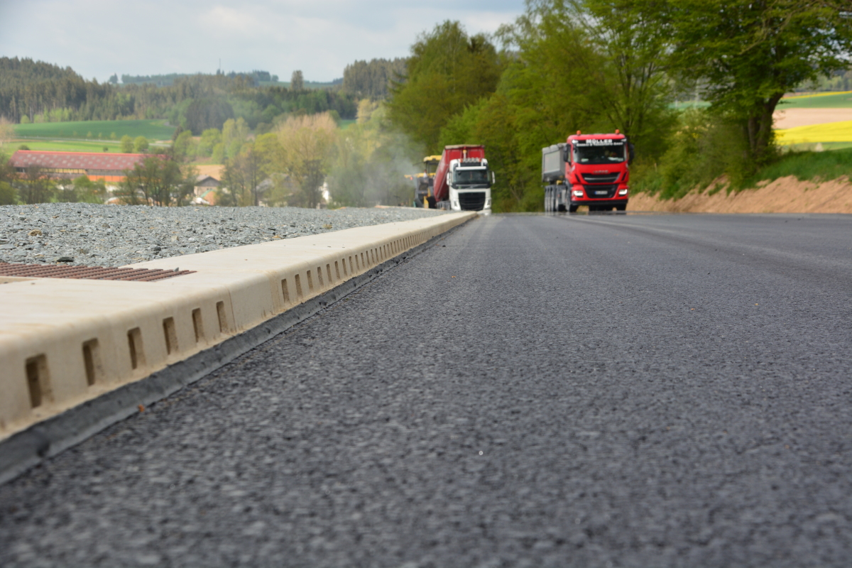 Straßensanierung ist nicht gleich Straßensanierung. Im Fall der St2693, wo zuvor lediglich die Entwässerung über einen Graben lief, gibt es eine Besonderheit. Unweit der Straße liegt im tiefergelegenen Gelände ein umzäuntes Grundstück mit einem unscheinbaren fensterlosen Gebäude. Darin befindet sich eine Trinkwasserentnahmestelle für die Region. Zum Schutz des Trinkwasserbrunnens soll das Oberflächenwasser der Straße aufgenommen und am Brunnen vorbeigeleitet werden. Auf rund 2 Kilometer Länge fanden großflächige und tiefe Ausgrabungen im Randbereich statt, große Dränage- und Sammelleitungen wurden neu gelegt, und aufwendige horizontale Abdichtungen neu in den Boden eingebracht. Wesentliche Vorgaben seitens der Bauherren waren, dass der vorhandene Straßenaufbau möglichst unberührt bleibt und die Entwässerung im Randbereich liegen und wenig tief einbinden soll. Daher fiel die Wahl auf die ACO Drain Kerbdrain Road – eine Hohlbordrinne.