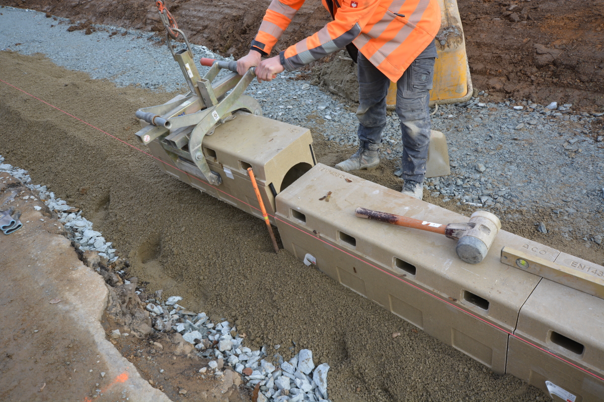 Diese findet nun erstmals in der aktuellen Ausgabe der „REwS“, der Richtlinie für die Entwässerung von Straßen, Ausgabe 2021 Beachtung. Die REwS ersetzt die bisher bekannte „RAS-Ew“, die Richtlinie für die Anlage von Straßen, Teil: Entwässerung, Ausgabe 2005. Nicht nur ein neuer Titel, sondern viele inhaltliche Neuerungen geben die Anleitung beim Straßenbau. Eine Neuerung liegt in der Aufnahme der Hohlbord-rinnen als separate Entwässerungsrinne – ein Rinnenstandard, der in vielen Bereichen und Anwendungen sehr gute Lösungsmöglichkeiten bietet. So auch bei dem Projekt der St2693, da sich trotz des wechselnden Neigungsverlauf die KerbDrain Road sehr gut im Straßenradius verlegen ließ.