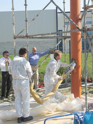 Die Leistungsschau begann bei einer oberirdischen Schlauchliner-Installation des Epros Drain Liners, der gerade im Bereich der Sanierung von Grundstücksentwässerungsleitungen zunehmend an Bedeutung gewinnt und führte über den Einbau einer partiellen Linerauskleidung bis hin zu einem für die meisten Gäste recht ungewöhnlichen Schlauchlining-Anwendungsfall in der Vertikalen: Für die Sanierung korrodierter Müll-Einwurfschächte in Hochhäusern wurde ein Linersystem konzipiert, das auf einem Glasfaser-Schlauchträger basiert und mit einem kalt härtenden Silikatharzsystem imprägniert wird. Der tiefere Sinn dieser spezifischen Harz-Wahl liegt in der latenten Gefahr von Bränden in zentralen Müll-Sammelsystemen: Der Silikat-Liner ist nämlich - im Gegensatz zu anderen aus der Kanalsanierung vertrauten Harzvarianten - nicht brennbar und erstickt jegliche Flammenbildung bereits im Ansatz, wie recht anschaulich gezeigt wurde. Großes Publikumsinteresse fand auch die Installation einer DrainMe Sleeve-Dichtmanschette, die sich in wenigen Minuten zur punktuellen, aber nachhaltigen Abdichtung von begehbaren Rohren aller Werkstoffe und Transportmedien einbauen läßt. Das Anwendungsspektrum reicht dabei von Abwasserkanälen bis hin zu Gas- und Ölpipelines.