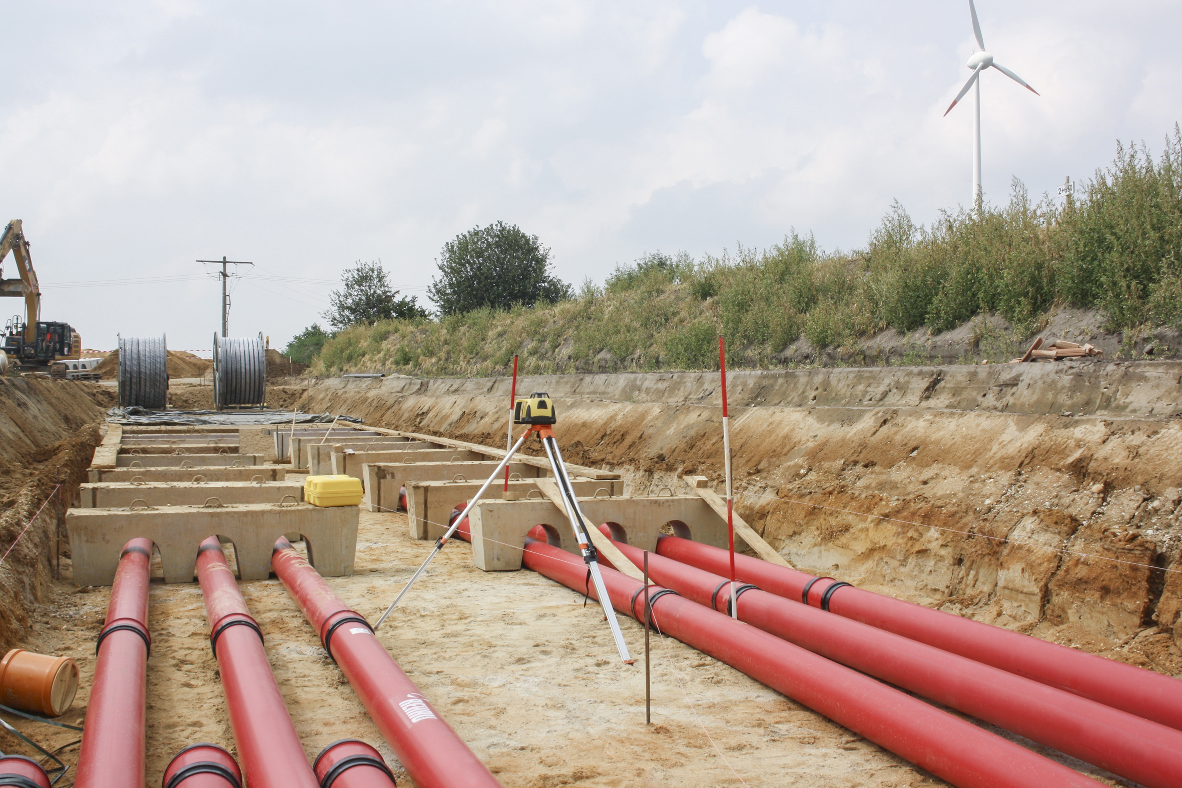 Insgesamt wurde auf 3,4 Kilometern Länge die 380 Kilovolt Neubautrasse als Vierer-System in Form von 12 Drehstromkabeln unter die Erde gelegt. Am Anfang und Ende des Erdkabelabschnittes wurde jeweils eine Kabelübergabestation gebaut, um die Kabel der anschließenden Freileitung unter die Erde zu führen. Aufgrund der erhöhten Anforderungen für erdverlegte Höchstspannungskabel entschied sich der Bauherr Amprion für die Verlegung der Kabel in RAUGUARD HV Schutzrohre. Damit konnten sowohl Vorteile bei der Verlegung sowie dem Kabeleinzug erzielt werden. Aufgrund der gewählten Rezeptur und dem Design des RAUGUARD HV Rohrsystems kann eine langfristige Betriebssicherheit und Werterhaltung der Erdkabeltrasse sichergestellt werden.
