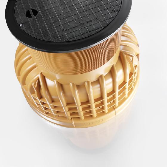 Aufgrund des horizontalen Einbaus des Verteilers im Schachtinneren und der dadurch bedingten horizontalen Lage der Erdwärmerohre kann das Erdreich um den Schacht herum zügig und unkompliziert verdichtet werden. Die vertikale und horizontale Verrippung verleiht dem Verteilerschacht zudem eine ausgesprochen hohe statische Stabilität - der Standard-Schacht ist begehbar bis 200 Kilogramm. In Kombination mit weiteren Bauteilen ist es möglich, den Schacht so umzubauen, dass er sich auch unter befahrbaren Flächen installieren lässt.