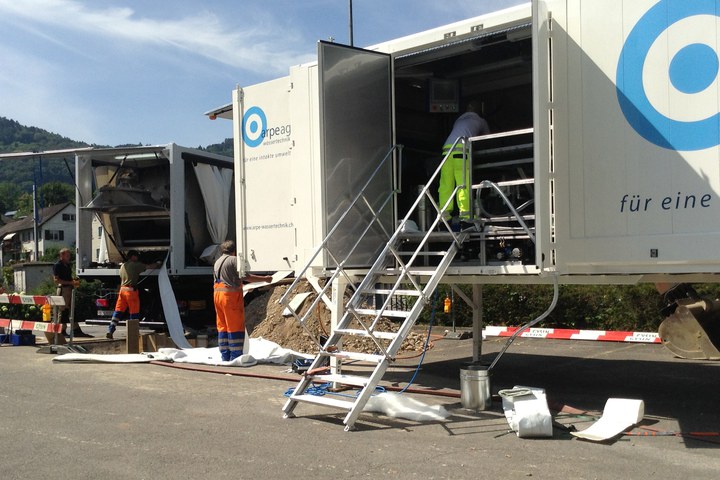In der Schweizer Gemeinde Niederdorf musste Ende August 2013 eine Trinkwasserleitung DN 200 rehabilitiert werden. Die defekte Leitung befand sich in unmittelbarer Nähe eines Bachlaufes und einer Bahntrasse in Ortsrandlage. Da eine Erneuerung der vorhandenen Trinkwasserleitung in offener Bauweise sehr aufwändig und kostenintensiv gewesen wäre und die dafür benötigte lange Bauzeit zu Versorgungsengpässen im Ortsnetz geführt hätte, entschloss sich die für die Leitung verantwortliche Wasserversorgung Niederdorf für eine Rehabilitierung der Leitung mit Hilfe eines statisch selbsttragenden Systems. In Absprache mit dem für die Planung beauftragten Ingenieurbüro GRG Ingenieure AG wollte man erstmalig das RS BlueLiner®-Verfahren der RS Technik AG einsetzen, um Erfahrungen mit dem neuen System zu sammeln. Weitere Unterstützung erfolgte durch die Aquaform AG, ein Unternehmen, das sich auf den Handel mit Rohren, Formstücken und Armaturen aus Kunststoff und Guss für den Gas- und Wasserleitungsbau spezialisiert hat. Innerhalb von nur zwei Wochen wurde die defekte Trinkwasserleitung DN 200 auf einer Länge von 70 m rehabilitiert. In dieser Zeit wurde die Leitung außer Betrieb genommen, gereinigt, mittels TV-Befahrung untersucht, der RS-BlueLiner® eingebaut, die Anbindung mit Hilfe von Manschetten vorgenommen und letztlich die erfolgreiche Sanierung über eine Druckprüfung mit 8,9 bar sichergestellt.