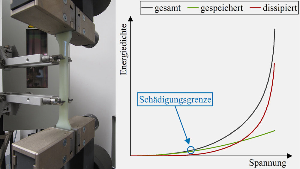 Für thermoplastische Kunststoffbauteile existiert bisher keine allgemeingültige Vorgehensweise zum Festigkeitsnachweis der Langzeit- bzw. Dauerfestigkeit. Eine besondere Herausforderung ist die Ermittlung werkstofflicher Einsatzgrenzen, um Materialschädigungen und zukünftiges Bauteilversagen zu verhindern. Bisherige Auslegungsverfahren sind meist mit erheblichem Prüf- und Kostenaufwand verbunden oder liefern bei Verwendung pauschaler Abminderungsfaktoren und hoher Sicherheitsbeiwerte meist sehr konservative Ergebnisse, was dem Wunsch nach Leichtbau und Ressourceneffizienz entgegensteht. Daher wurde für die Bestimmung derartiger Grenzwerte ein energiebasiertes Bemessungskonzept erarbeitet, welches auf Basis intermittierender Zugversuche die Detektion werkstofflicher Einsatzgrenzen durch eine Auswertung der Dehnungsamplitude erlaubt. Durch geeignete Zerlegung der umgesetzten Energie in gespeicherte und dissipierte Energieanteile kann eine kritische dissipierte Energiedichte bestimmt werden, welche charakteristisch für die Schädigungsgrenze des Werkstoffs ist. Unterhalb dieser Schädigungsgrenze ist der Werkstoff „dauerfest“ in dem Sinne, dass es auch nach sehr häufiger Belastung oder langen Belastungsdauern zu keinen Mikroschädigungen kommt, die später zu einem Bauteilversagen führen können.