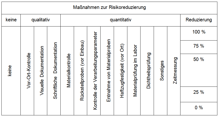 Der Anwender des Bewertungssystems kann daher, soweit möglich und gewollt, jedem Risiko eine Maßnahme zur Qualitätssicherung bzw. Qualitätskontrolle zuordnen. Qualitative Maßnahmen können Risiken reduzieren und unter Umständen auch deren Eintritt verhindern; quantitative Maßnahmen ermöglichen eine Risikoprävention. Tabelle 2 listet Maßnahmen zur Risikoreduzierung und Prävention auf. Die Skale der Risikoreduzierung geht von 0 % (keine Reduzierung) bis 100 % (vollständige Risikoprävention).