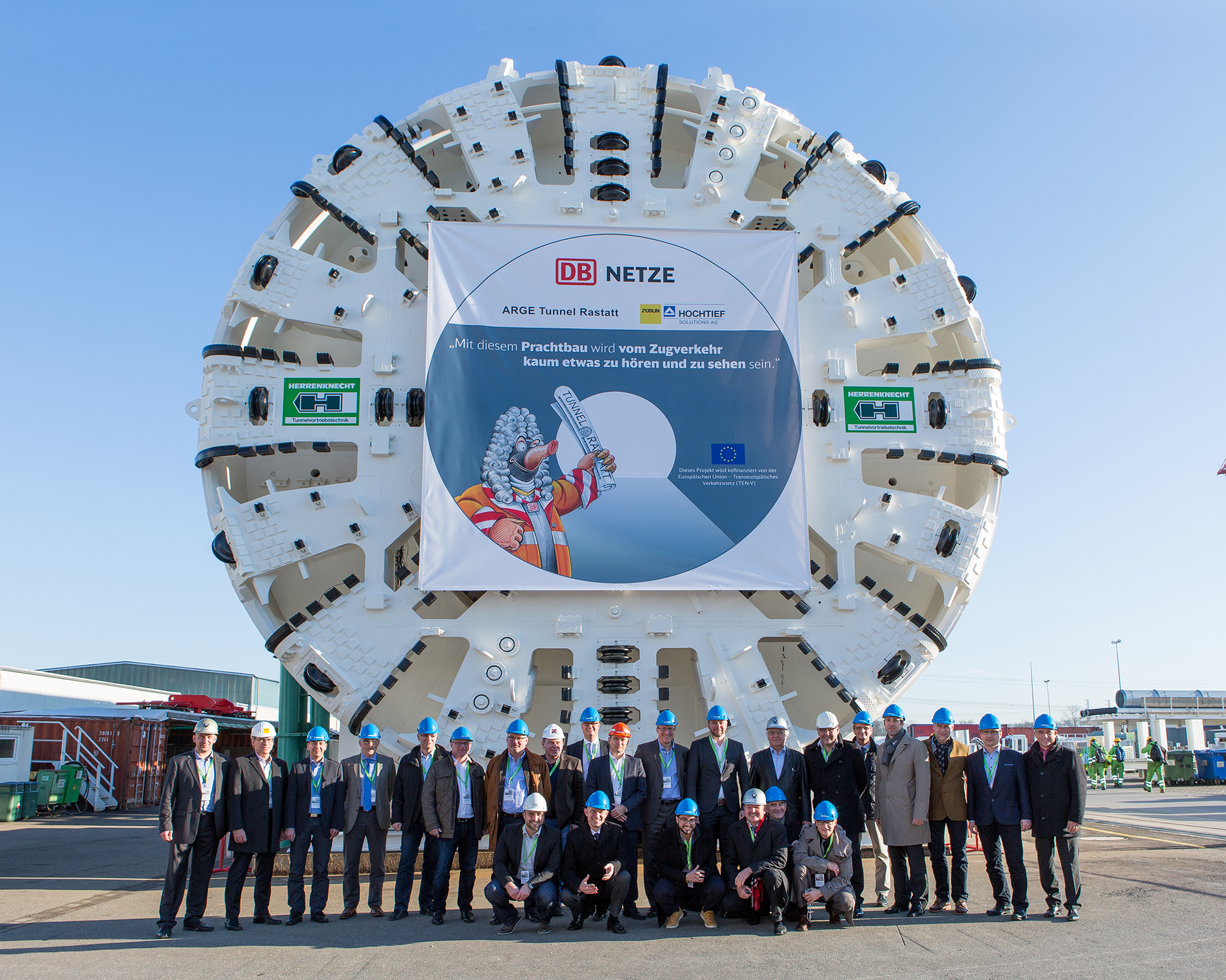 Die erste von zwei Tunnelbohrmaschinen (TBM) für den Tunnel Rastatt ist heute erfolgreich bei Herrenknecht in Schwanau vom Kunden abgenommen worden. Die beiden Mixschilde werden je eine rund 3.700 Meter lange Röhre des zweiröhrigen Tunnels auffahren und im Rohbau fertigstellen. Der Tunnel ist Bestandteil der Ausbau- und Neubaustrecke Karlsruhe – Basel auf der Güterverkehrsstrecke Rotterdam bis Genua.