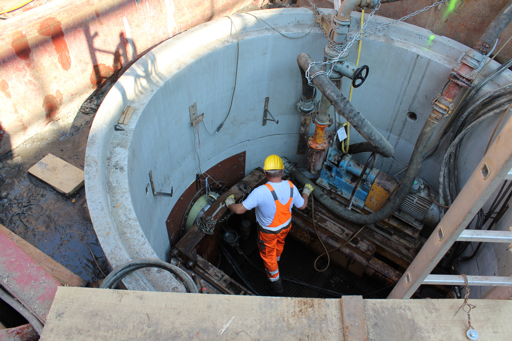 In Vorbereitung auf die Vortriebsarbeiten wurden beidseitig des Bahndamms 3,20 m bzw. 2,50 m tiefe Absenkschächte als Start- und Zielgrube mit einem Durchmesser von 3,20 bzw. 2,60 m hergestellt. Unter laufenden Bahnbetrieb wurde der Bahndamm 3 m unter den Gleisen aufgefahren.