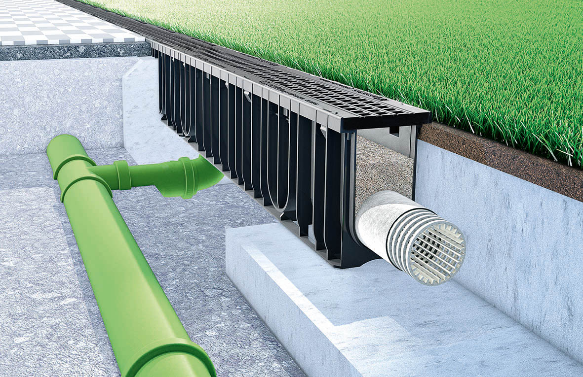 Die dafür erforderlichen Entwässerungs-Rinnenkörper lassen sich entlang des Kunstrasenfelds und der weiteren Sammelzonen einfach einbauen. Sie bestehen aus recyceltem und recyclingfähigem Polypropylen. Das Rinnensystem hat deshalb das Umweltsiegel „Blauer Engel“ erhalten.