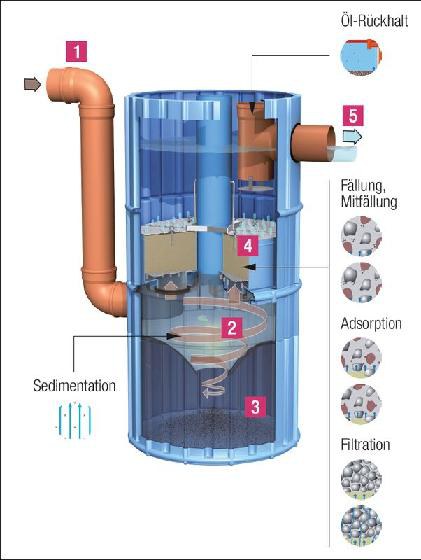 In der Mitte der Behandlungsanlagen befinden sich insgesamt vier Filterelemente. Mit ihnen werden im Aufstromverfahren Feinstoffe gefiltert. Ein Großteil der gelösten Schadstoffe wird ausgefällt und adsorptiv gebunden. Der Filter ist rückspülbar und im Falle einer völligen Verschlämmung austauschbar. Die Standzeit des Filters liegt im Regelfall bei drei Jahren. Der Schlammfang muss in Intervallen zwischen einem und fünf Jahren ausgesaugt werden.
