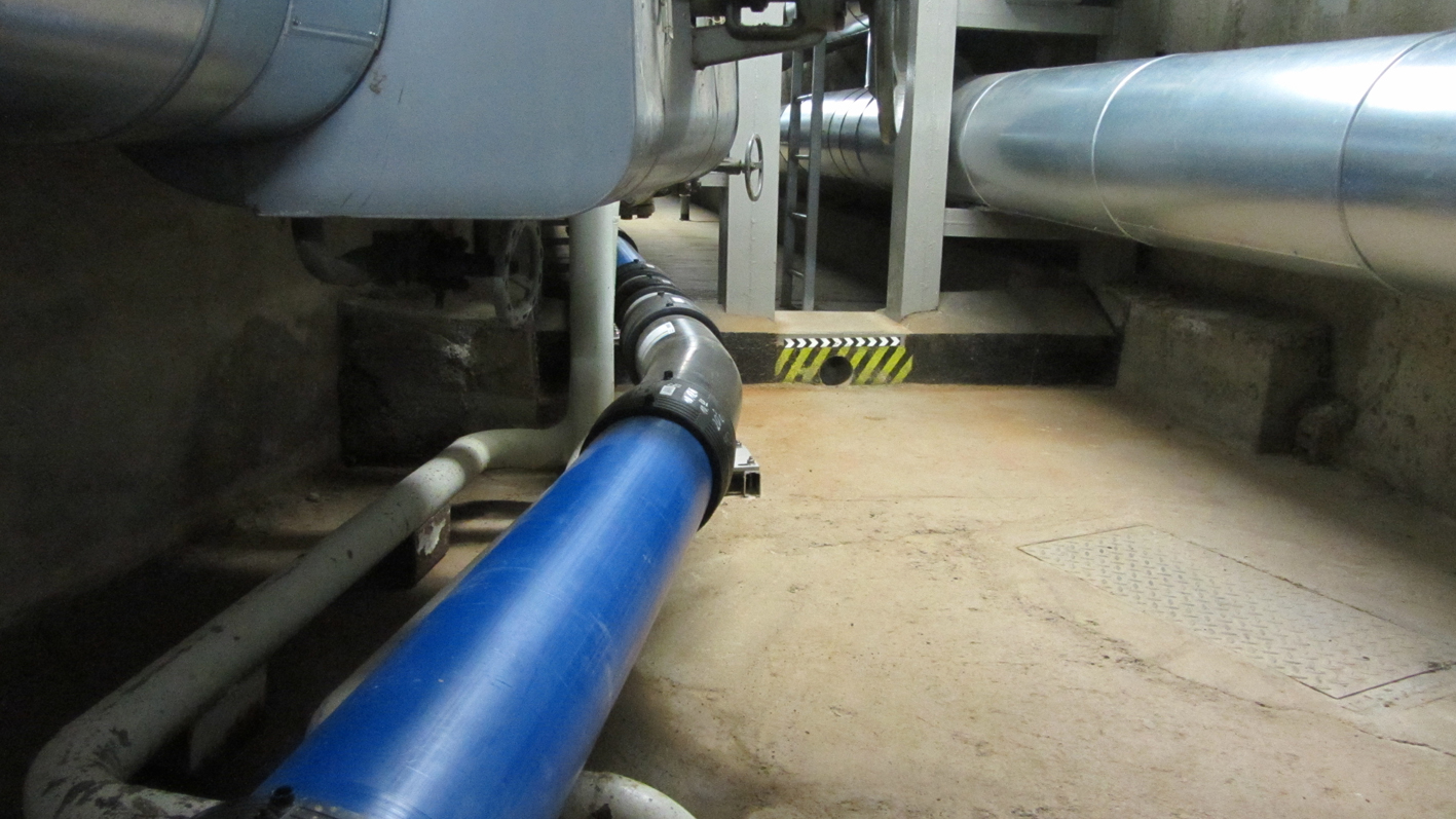 Verlegt werden sollte die neue Leitung auf Konsolen. Diese mussten teils als Festpunkte und teils als Gleitpunkte ausgelegt werden. An den Festpunkten wurde das Rohr mithilfe einer Edelstahlkonstruktion am Boden des Kollektors fixiert. Diese Festpunkte dienen der Aufnahme der Kräfte, welche infolge der temperaturbedingten Längenänderung der Rohre entstehen. Insgesamt neun in genau definierten Abständen eingebaute Axialkompensatoren DN 150 mit einer Baulänge von 270 mm +/– 40 mm stellen sicher, dass der Großteil der entstehenden Kräfte ausgeglichen wird und die Festpunkte lediglich einen geringen Teil aufnehmen müssen.