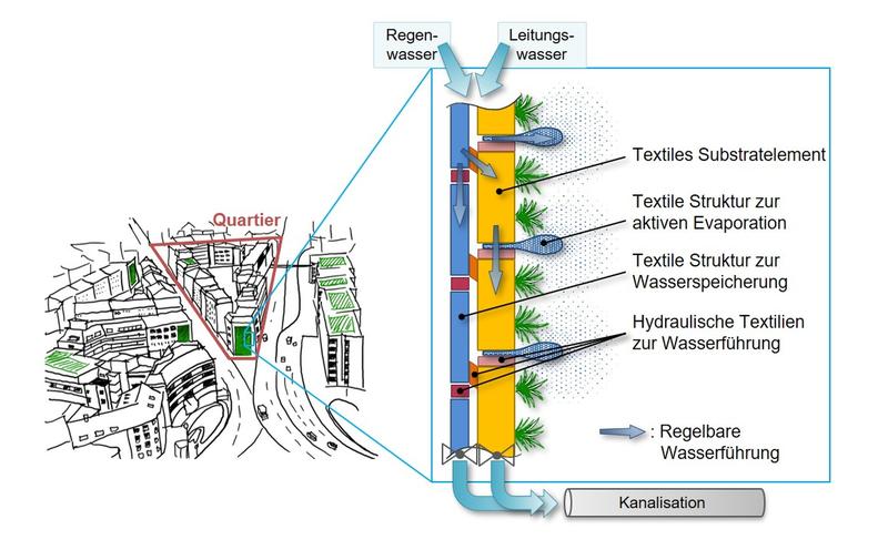 Durch Nachverdichtung wird zwar bestehende Infrastruktur genutzt und Zersiedelung vermieden, aber es steigt der Anteil an versiegelten Flächen. Das wirkt sich negativ auf Umwelt und Klima aus. Fassadenbegrünungen bringen hier mehr Grün in die Städte. Werden textile Speicherstrukturen eingesetzt, können sie sogar aktiv zum Hochwasserschutz beizutragen. Die Deutschen Institute für Textil- und Faserforschung (DITF) haben eine entsprechende „Living Wall“ entwickelt.