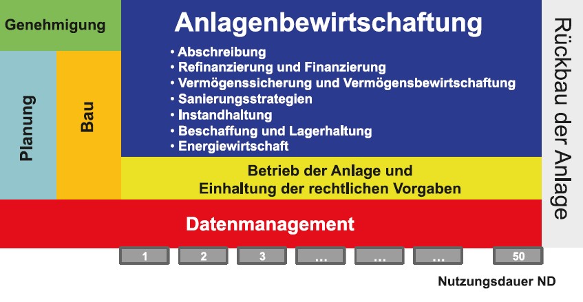 Bild 1: Management von Infrastrukturanlagen ihrer technischen Nutzungsdauer Anlagenbewirtschaftung und Vermögensbewirtschaftung sind die überwiegende Tätigkeit von der Planung bis zum Rückbau einer Anlage – qualitativ dargestellt für eine 50-jährige Nutzungsdauer. [Quelle: STEIN Ingenieure GmbH]