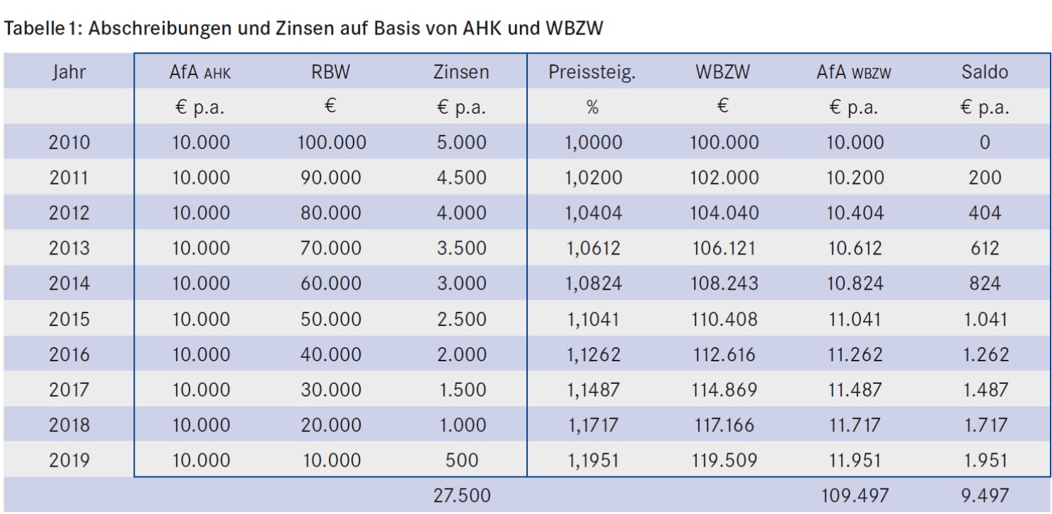 In der Tabelle sind für eine Investition von 100.000 Euro und einer Nutzungsdauer von 10 Jahren die Abschreibungen AfA AHK auf Basis der AHK und AfA WBZW auf Basis der WBZW bei einer Preissteigerung jährlich von gleichbleibend 2 % sowie die Zinsen auf die Restbuchwerte RBW von 5 % ausgewiesen. Die jährlichen Salden der Abschreibungsbeträge auf Basis der AHK und der WBZW dürften selbsterklärend sein und sind in der Spalte Saldo ausgewiesen.