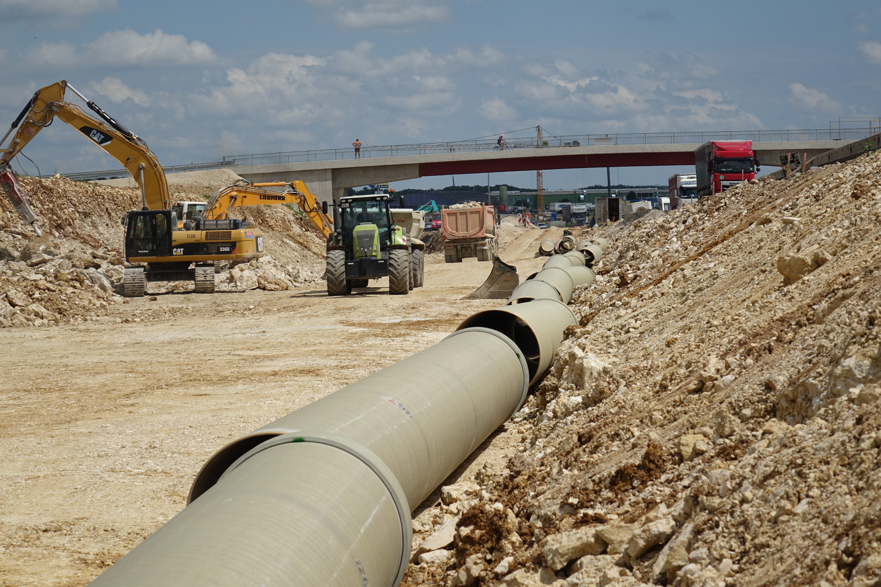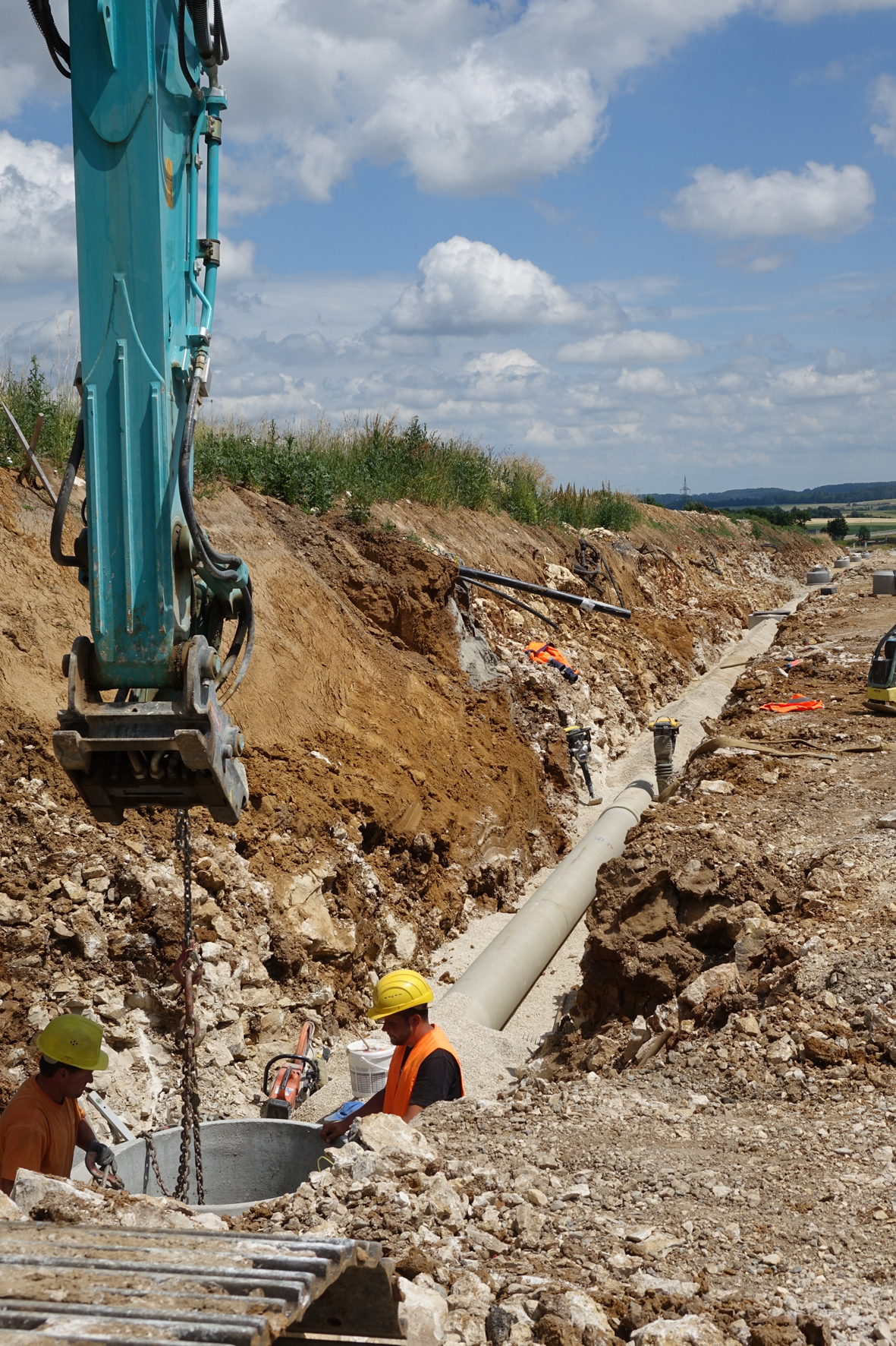 Gestemmt wird das Millionen-Projekt in vier Bauabschnitten, wobei der rund 6 km lange Bauabschnitt 4 zwischen Nellingen und Hohenstadt nach europaweiter Ausschreibung an die Josef Rädlinger Bauunternehmen GmbH aus dem oberpfälzischen Cham ging. Allein hier wurden ca. 551.000 m3 Boden verschiedener Bodenklassen abgetragen sowie 7 Brückenbauwerke bzw. Unterführungen erstellt, eines davon durch die DB Netz AG. Da sich das Baufeld in einem Wasserschutzgebiet III befindet, sind die Anforderungen an die Streckenentwässerung und die dabei verwendeten Rohrleitungen besonders hoch. So entschied sich das Regierungspräsidium Tübingen als Bauherr für die Verwendung des Flowtite GFK-Rohrsystems, das von der Amiantit Germany GmbH geliefert wird. Insgesamt kommen rund 10.000 m Flowtite GFK-Rohre in Nennweiten von DN 300 bis DN 1.200 im Mittelstreifen und beidseitig der Autobahn, unweit der Ortes Merklingen, zum Einsatz.