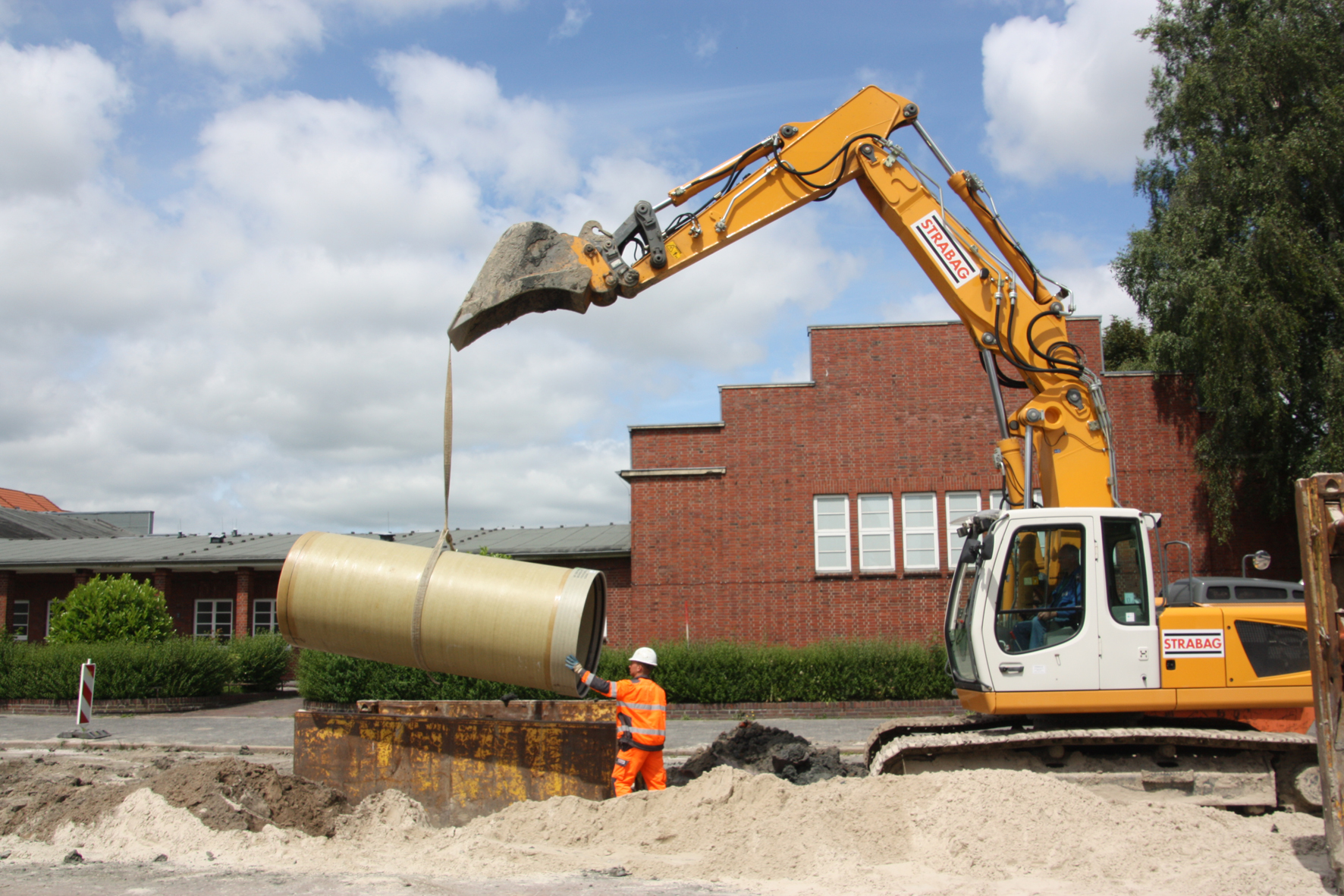 Die Stadt Wilhelmshaven bringt in diesen Tagen einiges ins Rollen, und das darf man ruhig wörtlich nehmen: Zu den großen Investitionsprojekten, welche die kreisfreie Stadt am Jadebusen nachhaltig prägen werden, zählt ein umfassendes Konzept zur Verbesserung der Radverkehrsinfrastruktur. Unter anderem wird die 660 m lange Schellingstraße zur Fahrradstraße umgestaltet; dafür wird die in baulich schlechtem Zustand befindliche Straße grundlegend saniert. Bei der Entscheidung für die vom Bund geförderte Verkehrsberuhigungsmaßnahme hat nicht zuletzt die Tatsache eine wichtige Rolle gespielt, dass die Schellingstraße als Zufahrtsstraße zum nahegelegenen, im Herbst 2013 eröffneten Neuen Gymnasium Wilhelmshaven dient. Der Auftraggeber, die städtischen Technische Betriebe Wilhelmshaven (TBW), beschloss, im Zuge der notwendigen Umgestaltung auch die Kanalisation der Schellingstraße zu sanieren und dabei sowohl den Sammler als auch die Hausanschlüsse und Sinkkastenleitungen zu erneuern. Auch die Haltungen wurden hydraulisch neu berechnet, da der alte Sammler aus Steinzeug ungenügend dimensioniert war, was bei Starkregenereignissen immer wieder zu Überschwemmungen der Schellingstraße sowie der angrenzenden Straßenzüge geführt hatte. Für die Planung der Baumaßnahme zeichnet die Ingenieurgesellschaft Nordwest mbH verantwortlich. Den Auftrag für die Erstellung des neuen Mischwasserkanal führt die STRABAG AG, Direktion Nordwest, Bereich Weser-Ems/Gruppe Wilhelmshaven mit FLOWTITE GFK-Wickelrohren der AMITECH Germany GmbH aus; ein 200 m langes Teilstück des 660 m langen Kanals wird als Stauraumkanal dienen. Ausschlaggebend für die Entscheidung zugunsten von glasfaserverstärkten Kunststoffrohren war neben den hervorragenden Produkteigenschaften vor allem das problemlose Handling auf der Baustelle, von dem sich das ausführende Unternehmen bereits bei anderen Tiefbau-Maßnahmen gute Erfahrungen gemacht hatte, zuletzt beim Bau einer Abwasserdruckleitung in Wilhelmshaven.