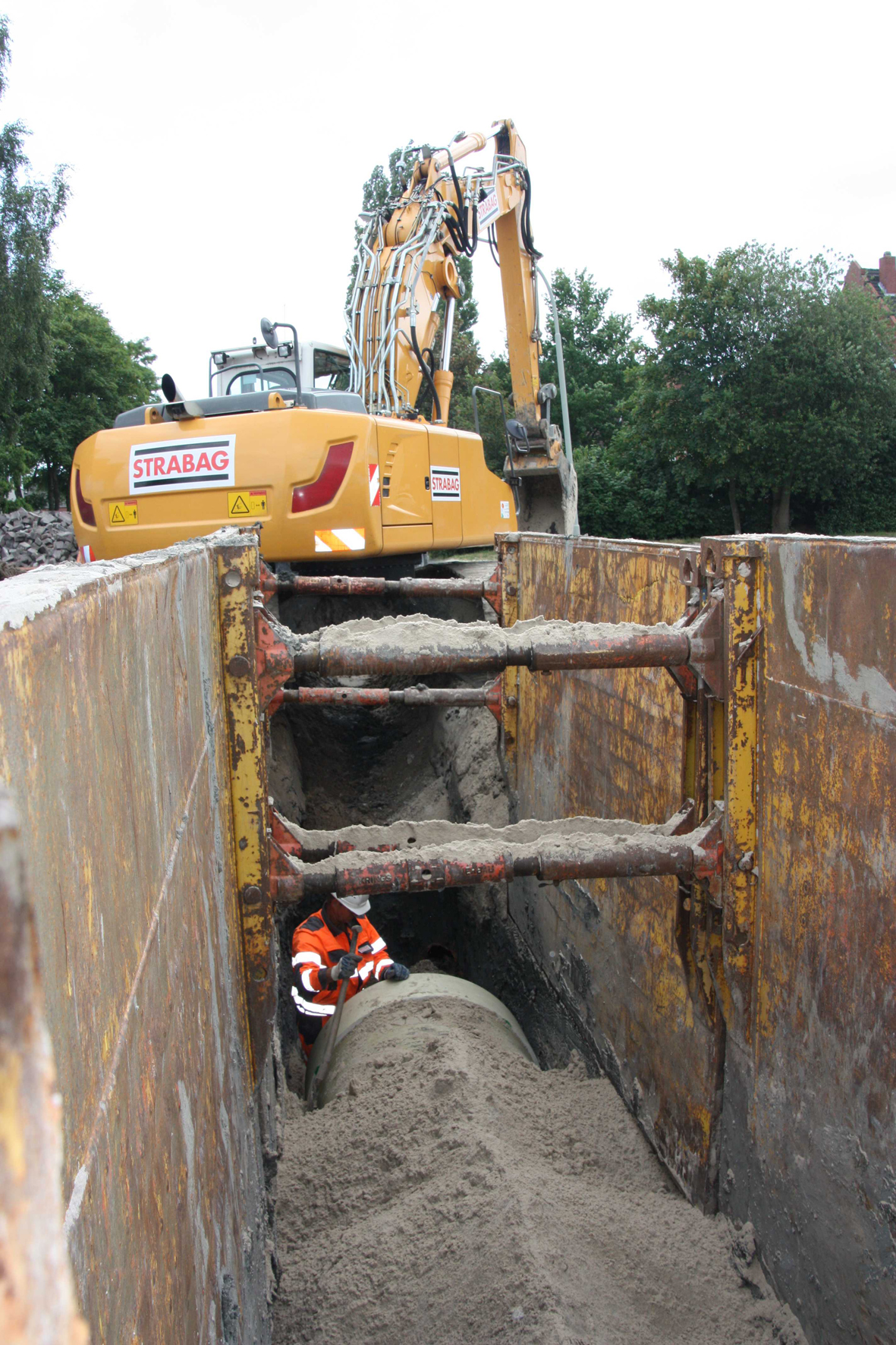 Dipl.-Ing. Hueseyin Akkurt, technischer Gruppenleiter bei der STRABAG AG, arbeitet nicht zum ersten Mal mit den FLOWTITE-Rohren. " Mit GFK-Rohren von AMITECH haben wir in der Vergangenheit bereits mehrfach gute Erfahrungen gesammelt – zuletzt beim Bau einer Abwasserdruckwasserleitung DN 1.200 zwischen dem Pumpwerk Süd und der Zentralkläranlage in Wilhelmshaven." Die Umsetzung des Projektes, im Zuge dessen rund 6 km Haltungen in Wilhelmshaven verlegt wurden, war reibungslos vonstatten gegangen. Bei der Sanierung der Schellingstraße empfahlen sich glasfaserverstärkte Kunststoffrohre aus mehreren Gründen. Laut des vom Planungsbüro Ingenieurgesellschaft Nordwest mbH erstellten Bodengutachtens besteht der Untergrund im Bauabschnitt aus Kleiboden mit Torfeinlagerungen, darunter befinden sich schluffige Sande. Die Verlegung von schweren Rohren – etwa aus Beton – hätte eine Gründung mit Bohrpfählen erfordert. "Dieses Verfahren hätte vergleichsweise hohe Kosten verursacht, den Zuschlag bekommen haben deshalb GFK-Rohre", so Akkurt weiter. Die spielen aber noch einen weiteren produkttypischen Vorteil aus: "Aufgrund der im Vergleich zu Betonrohren deutlich dünneren Rohrwandung von GFK-Rohren fällt auch deutlich weniger Aushub an – folglich sinken auch die Kosten für den Bodenaustausch", erläutert Akkurt. Nicht zuletzt sind die GFK-Rohre durch ihr geringeres Gewicht auf der Baustelle leichter zu handhaben als Rohre aus anderen Werkstoffen, sodass auch nur leichteres Baugerät erforderlich ist. In Wilhelmshaven verlegt wurden 460 m Rohre in DN 500, weitere 200 m der Leitung wurden zu DN 1.200 aufdimensioniert und dienen zukünftig als Stauraumkanal. Da zahlreiche Leitungen queren und die Rohre dem eingesetzten Verbau angepasst werden sollten, wurde mit Rohren von 3 m Baulänge gearbeitet.