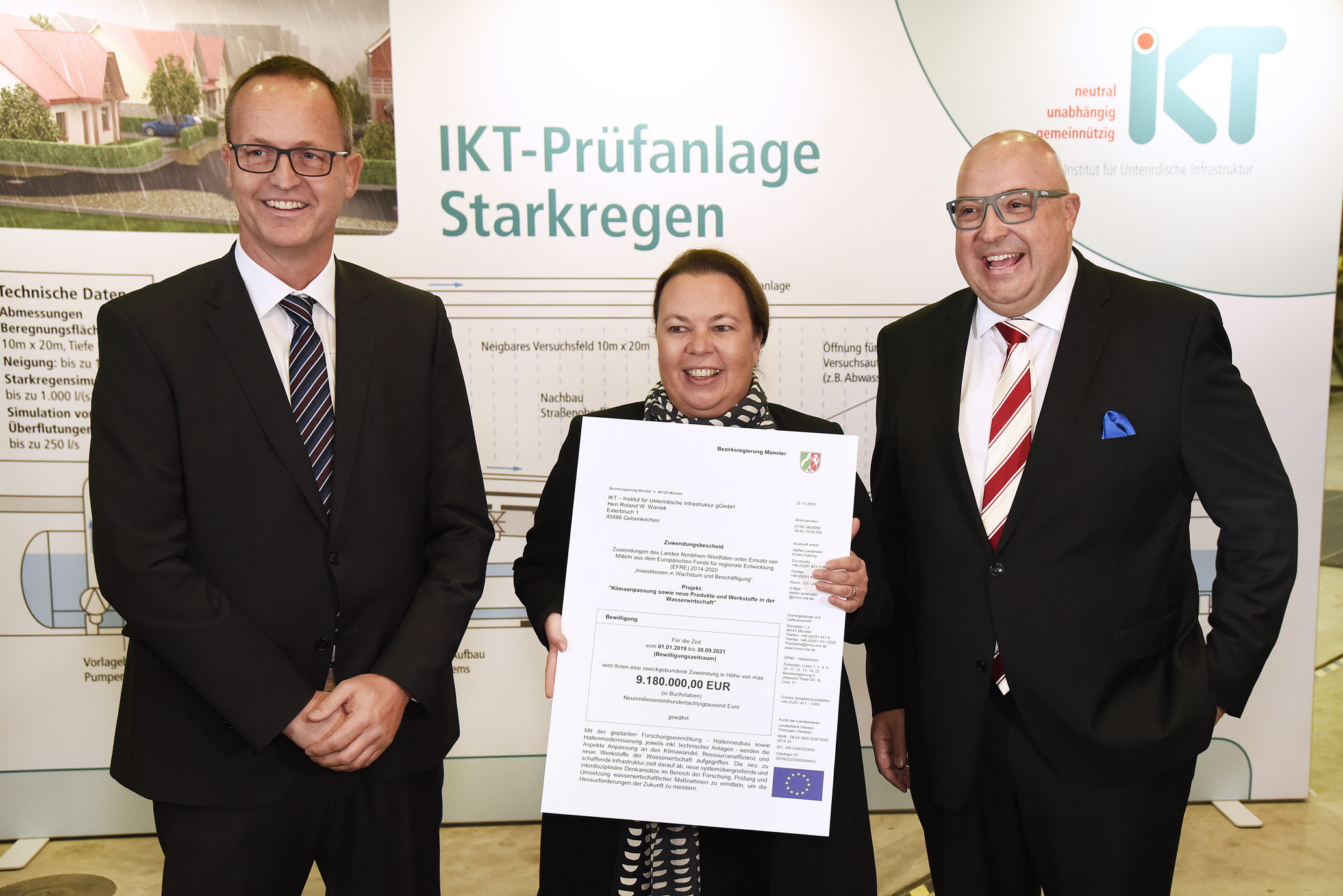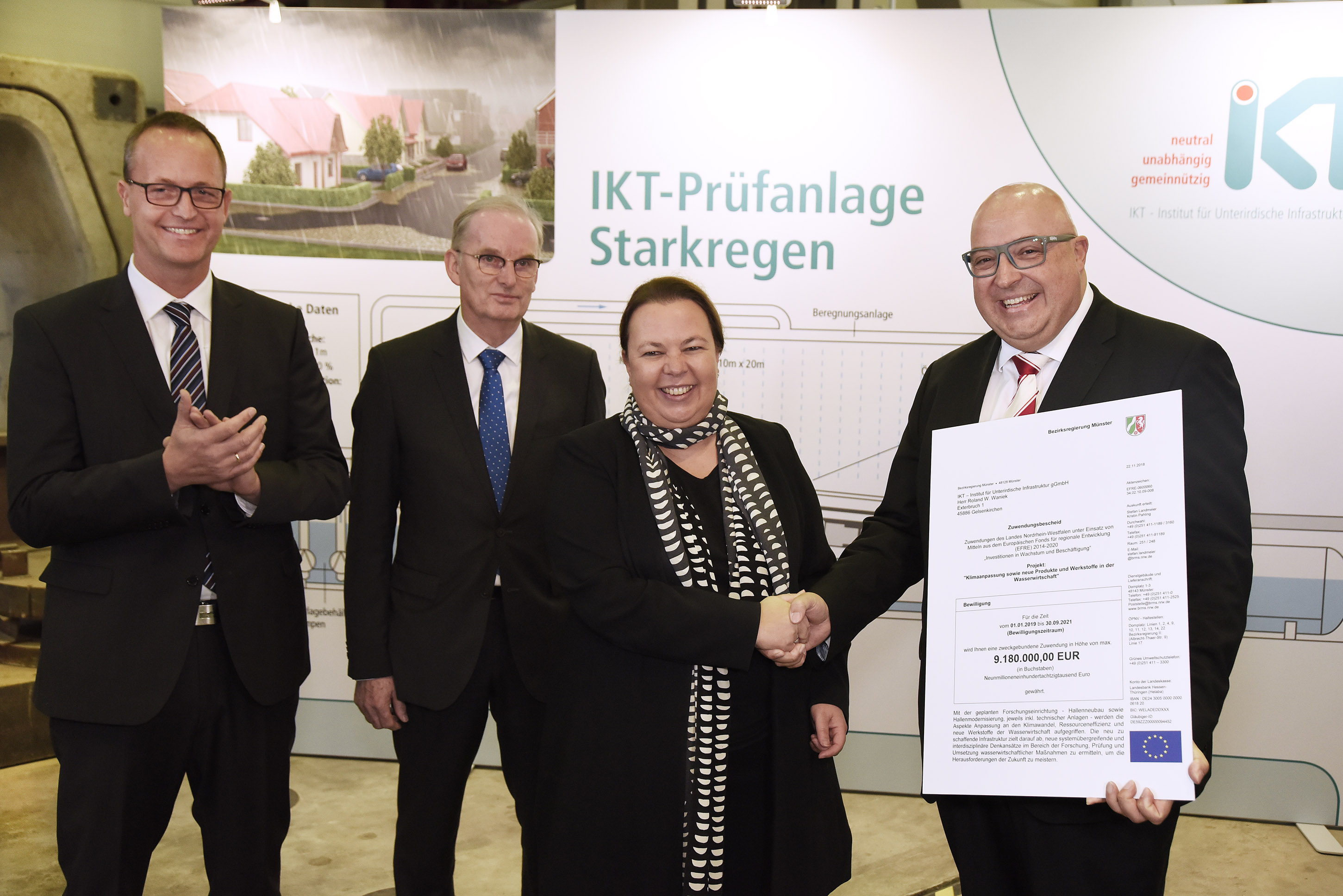 NRW-Umweltministerin Ursula Heinen-Esser hat jetzt das IKT besucht und den millionenschweren Förderbescheid überreicht. Ziel des Ganzen: Überflutungen durch lokale Starkregen verhindern und Menschen und Gebäude schützen. „Ich bin gespannt auf die Ergebnisse, die Sie mit diesen Mitteln zugunsten einer nachhaltigen, klimaresilienten Infrastruktur erreichen werden“, sagte die Ministerin bei ihrem Besuch.