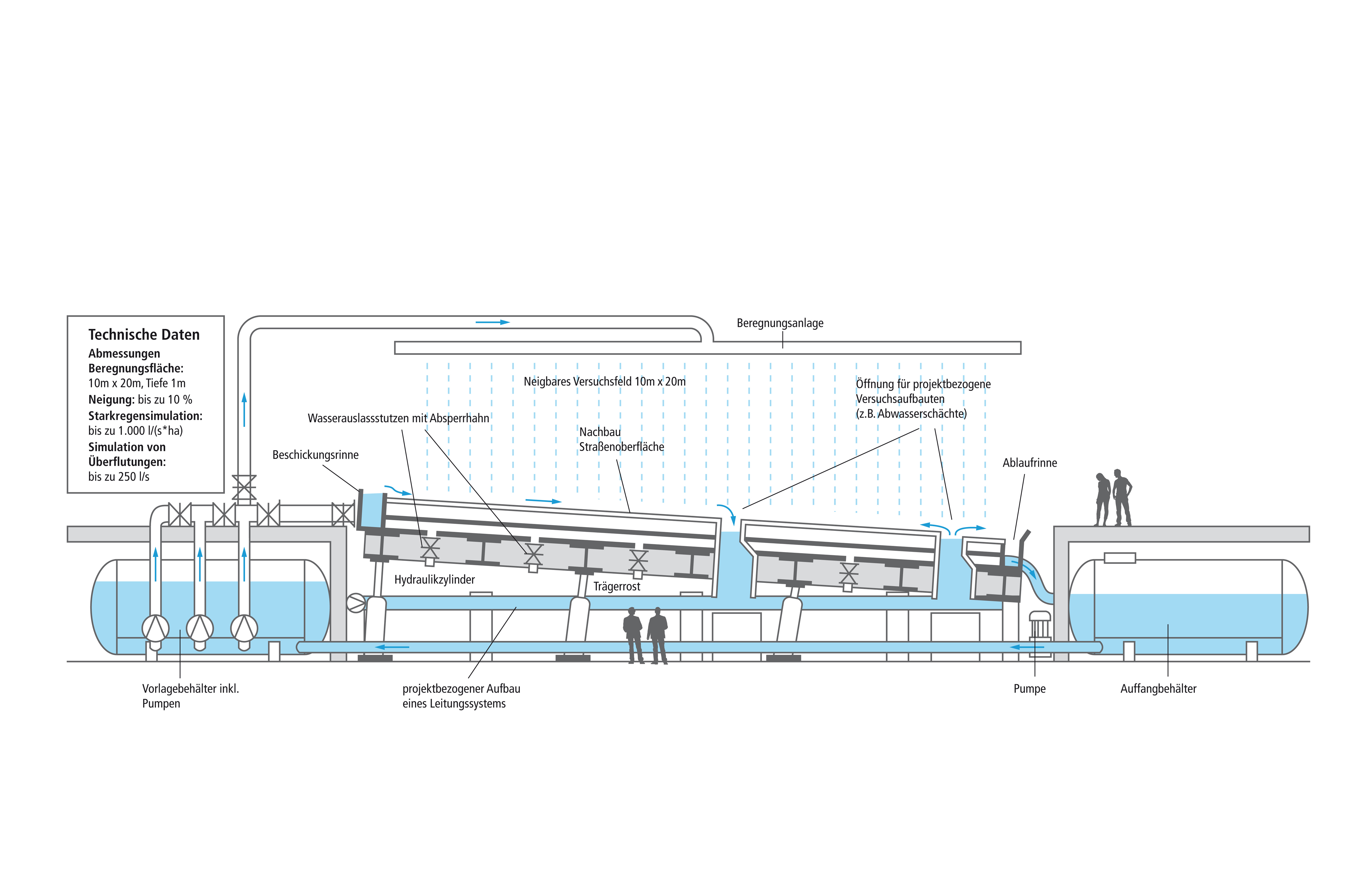 In einem Wasserkreislauf, der von mächtigen Pumpen angetrieben wird, werden wieder und wieder Überflutungen simuliert, um das Verhalten und die Leistungsfähigkeit des Straßen- und Entwässerungssystems mit seiner Schutzwirkung für Mensch und Immobilie zu beobachten.