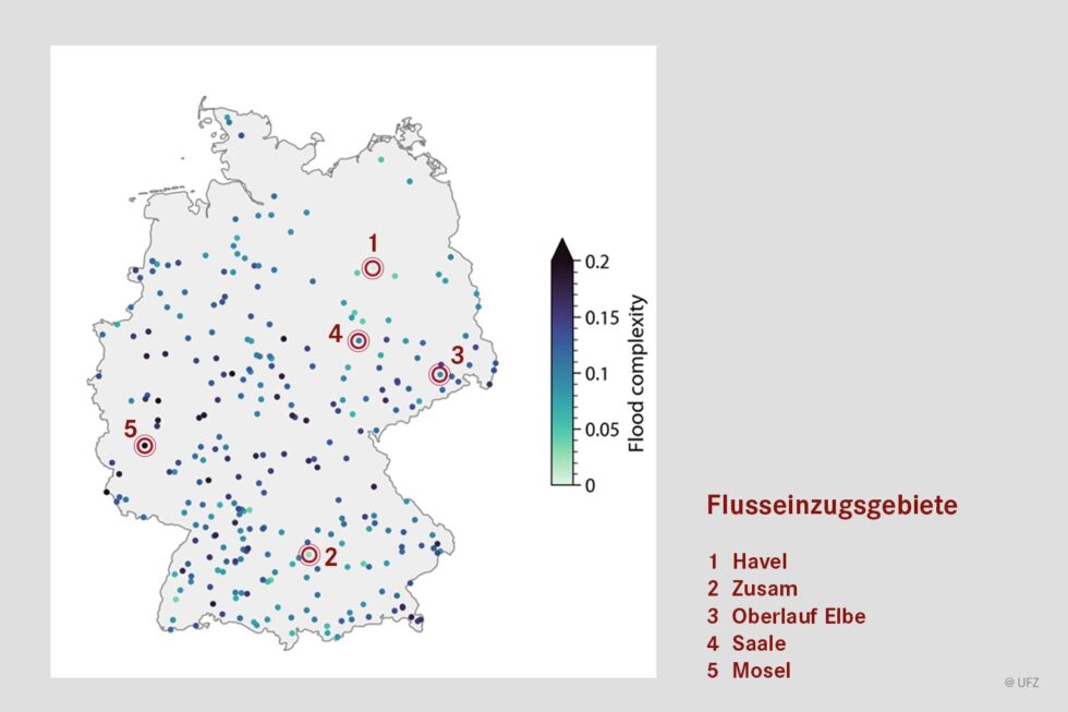 In Deutschland zählen die Havel und die Zusam, ein Nebenfluss der Donau in Bayern, zu den Flusseinzugsgebieten mit niedriger Hochwasserkomplexität. Regionen mit hoher Hochwasserkomplexität sind hingegen Ostbrasilien, die Anden, Ostaustralien, die Rocky Mountains bis zur US-Westküste sowie die west- und mitteleuropäischen Ebenen. In Deutschland gehören dazu beispielsweise die Mosel und der Oberlauf der Elbe. “Einzugsgebiete in diesen Regionen weisen in der Regel mehrere Überflutungsmechanismen auf”, erklärt Jakob Zscheischler. So können Flusseinzugsgebiete in den europäischen Ebenen von Überschwemmungen betroffen sein, die durch das Zusammenspiel von hohen Niederschlägen, Schneeschmelze und hoher Bodenfeuchte verursacht werden.