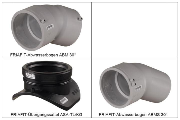 Kompakte Abwasserbögen mit integrierten Heizwendeln für den Hausanschlussbereich und ein Abwassersattel mit integrierter Steckmuffe auf PVC/PP-Rohre erweitern das FRIAFIT-Abwassersystem für PE-HD Kanalrohre.