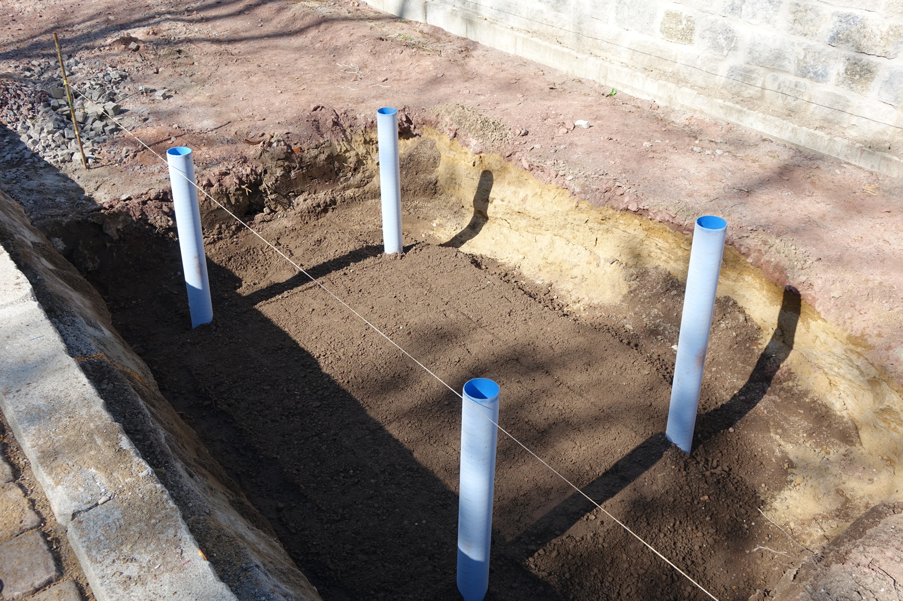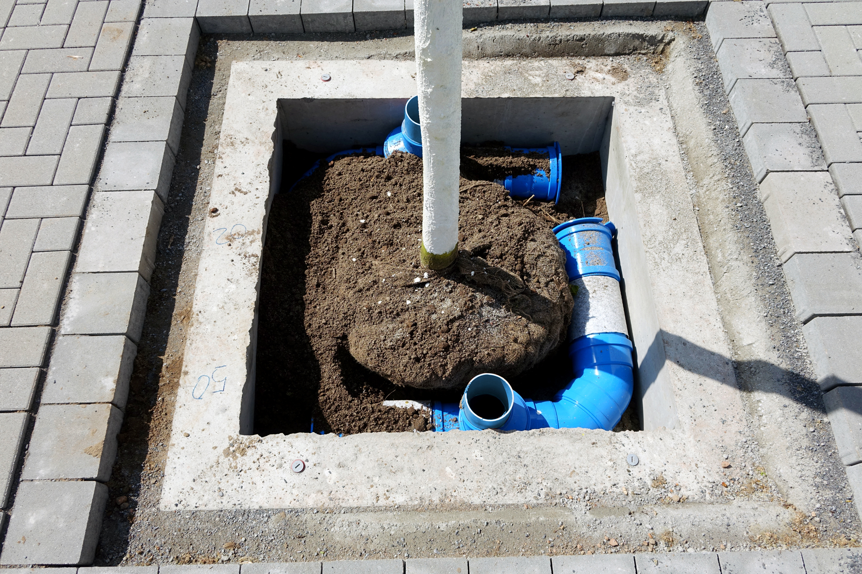 Im nächsten Schritt wurde die Grube verfüllt und die im Betonwerk als Sonderanfertigung vorgefertigte Betonschutzglocke gesetzt. Nach Füllen der Glocke mit Substrat bauten die Arbeiter von HEIN-BAU die Funke-Baumbewässerungswinkel ein. Die zu einem Winkel verbundenen geschlitzten und wandverstärkten Rohre der Nennweite DN/OD 160 werden im oberen Drittel des Wurzelballens eingebaut und versorgen den Wurzelbereich gezielt mit Wasser und Nährstoffen. Ein Baumbewässerungswinkel verfügt in der Standardausführung über eine Schenkellänge von ca. 1,36 x 1,62 m und fasst ca. 60 Liter Wasser.