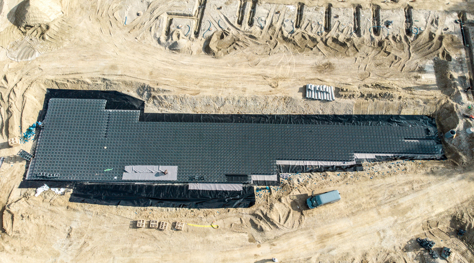 Damit können Einzelvolumina von bis zu 50 m³ auf die Baustelle geliefert werden. Der Einbau kann dann in Anlehnung an die Vorgaben der DIN EN 1610 wetterunabhängig durch die Baufirma erfolgen. Bei höherem Volumenbedarf können verschiedene KS-Bluebox®-Elemente vor Ort an der Einbaustelle miteinander verbunden werden.