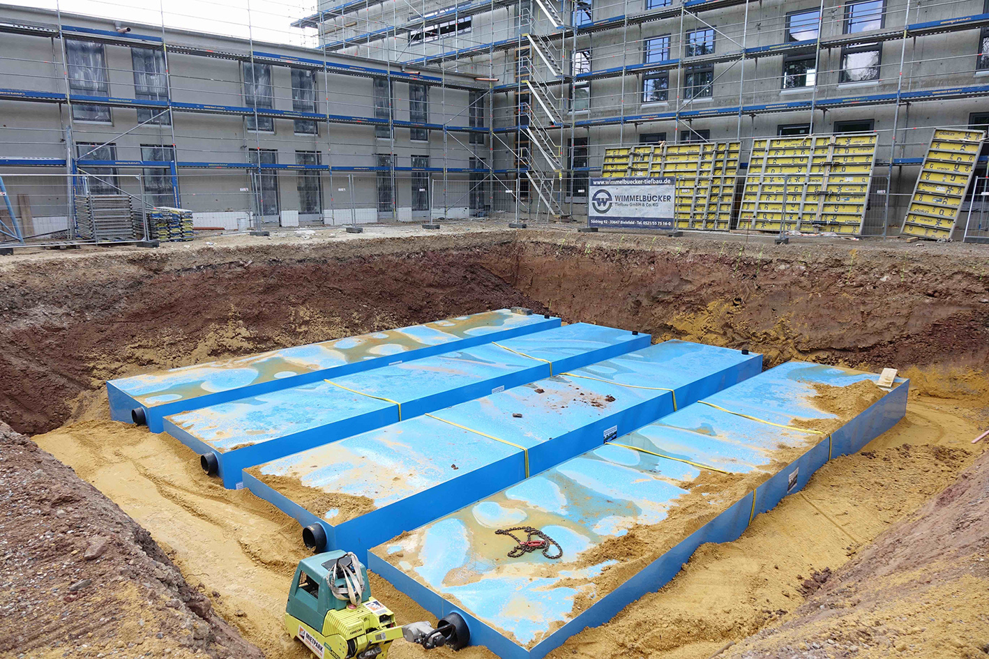 Die Erstellung der Regenrückhalteanlagen kann dabei sowohl bauseits durch eine wasserdichte Umhüllung mit einer Kunststoffdichtungsbahn als auch werkseitig durch eine Ummantelung mit PE-Platten als KS-Bluebox® erfolgen.