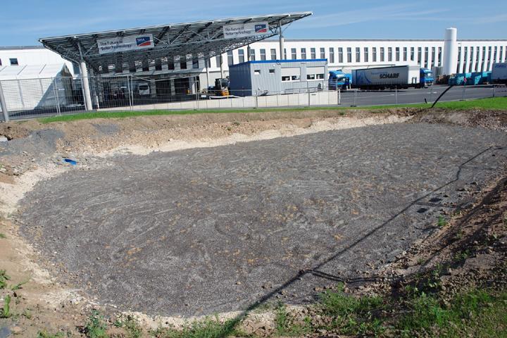 Fortschrittlich und umweltbewusst zeigte sich das Unternehmen auch beim Umgang mit dem anfallenden Niederschlagswasser auf dem neuen Firmengelände: Statt einer Einleitung in die örtliche Kanalisation wird das Regenwasser zu einem Teil über ein Regenwasserrückhaltebecken in die Vorflut eingeleitet, zum anderen Teil über eine mit D-Rainclean®-Substrat gefüllte Mulde versickert. Das Material von der Funke Kunststoffe GmbH nimmt mit Schadstoffen belastetes Niederschlagswasser auf, um es in unbedenklichem Zustand an den Boden abzugeben.
