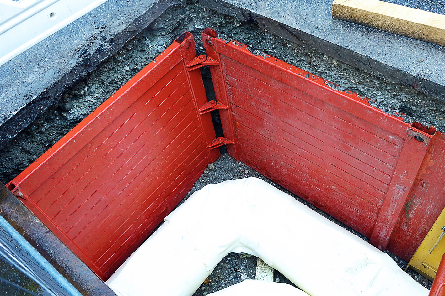 Winkelbereiche sind auf vielen Baustellen eine Herausforderung. Hierfür hat die thyssenkrupp Infrastructure den sogenannten krings randgestützten Eckverbau entwickelt. Das strebenfreie Verbausystem ist vor Ort flexibel einsetzbar und eignet sich hervorragend, um Richtungsänderungen im verbauten Rohrgraben bis zu 90 Grad herzustellen.