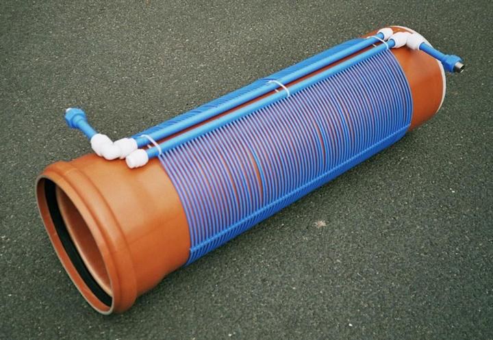 - Jedes konventionelle Kanalrohr, ob klein oder groß, oder aus Beton, Kunststoff, Steinzeug, oder Guss, kann vergleichsweise sehr kostengünstig mit einer entsprechend auf Maß konfektionierten Kapillarrohrmatte entweder schon werkseitig, oder erst im Rohrgraben ausgerüstet werden. Derartige Kapillarrohrmatten werden schon erfolgreich auch als Erdwärmekollektoren eingesetzt, weil sie über die dünnen und eng angeordneten Kapillarrohre eine thermisch sehr effiziente und gleichmäßige Wärmeübertragungsfläche mit hohem Wirkungsrad schaffen.