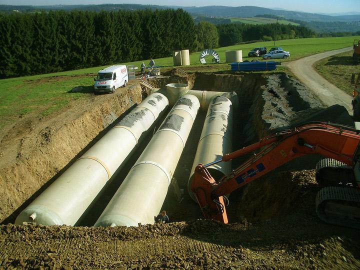 Die Staukanal-Installation auf GFK-Basis ist ein besonders gutes Beispiel für die Leistungsbreite des FLOWTITE-Systems, denn hier kommt es letztlich nicht nur auf "große Rohre" an: Eine spezielle Stärke des GFK-Rohrs sind die maßgefertigten Überlaufe in Quelltopf-Technologie. Diese extrem kompakte Lösung ist sehr schnell und platzsparend zu installieren.