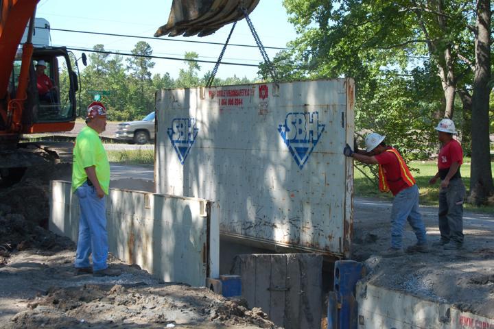 Beim Rollenschlitten-Gleitschienenverbau der SBH Tiebautechnik, Heinsberg, werden die einzelnen Verbaukomponenten erst im Graben zu einer geschlossenen Verbauwand komplettiert. Platten, Träger und Rollenschlitten sind zueinander parallel verschiebbar. Der Graben bleibt zu jeder Zeit der Bauphase auf gleicher Breite, auch beim Absenken oder Ziehen der Träger.