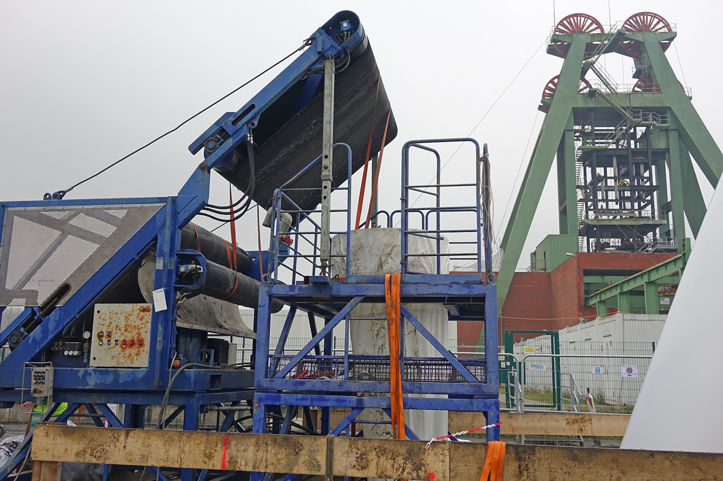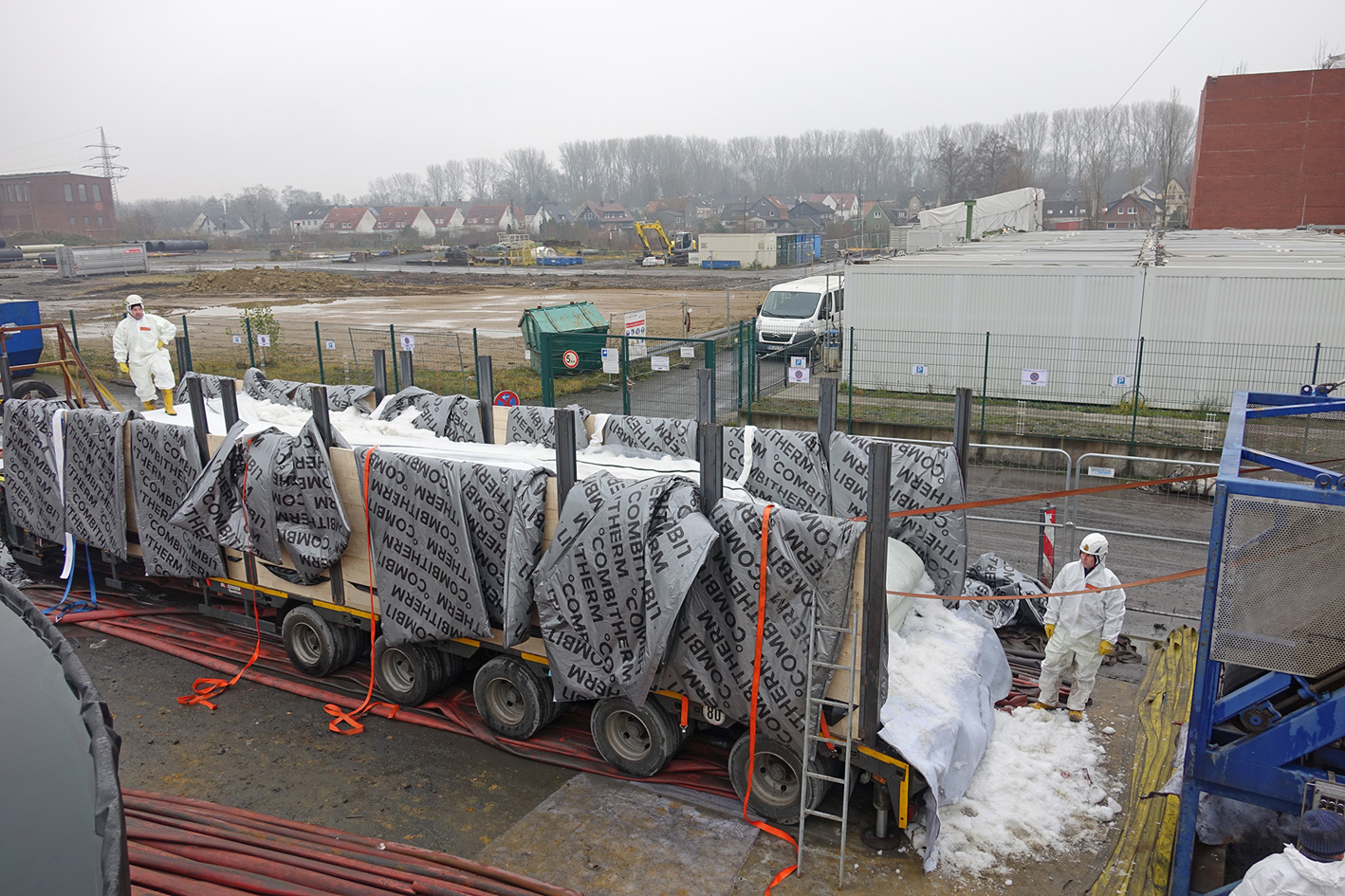 „Anschließend wurde der Schlauchliner über ein Förderband vom Lkw zum Inversionsgerüst gezogen und das offene Ende so fixiert und befestigt, dass eine kontinuierliche Wassereinleitung erfolgen konnte“, beschreibt Olschewski den weiteren Ablauf. Der hydrostatische Druck des Wassers bewirkt die Inversion des Schlauchliners in die zu sanierende Haltung – ein Vorgang, der bei der Dimension des Liners rund acht Stunden in Anspruch nahm. Hierbei musste darauf geachtet werden, dass mittels Steuerung der Wasserzugabemenge die Inversion kontinuierlich verlief. Ein am so genannten Linerkopf befestigtes Sicherungsseil dient dabei zur Kontrolle der Inversionsgeschwindigkeit.