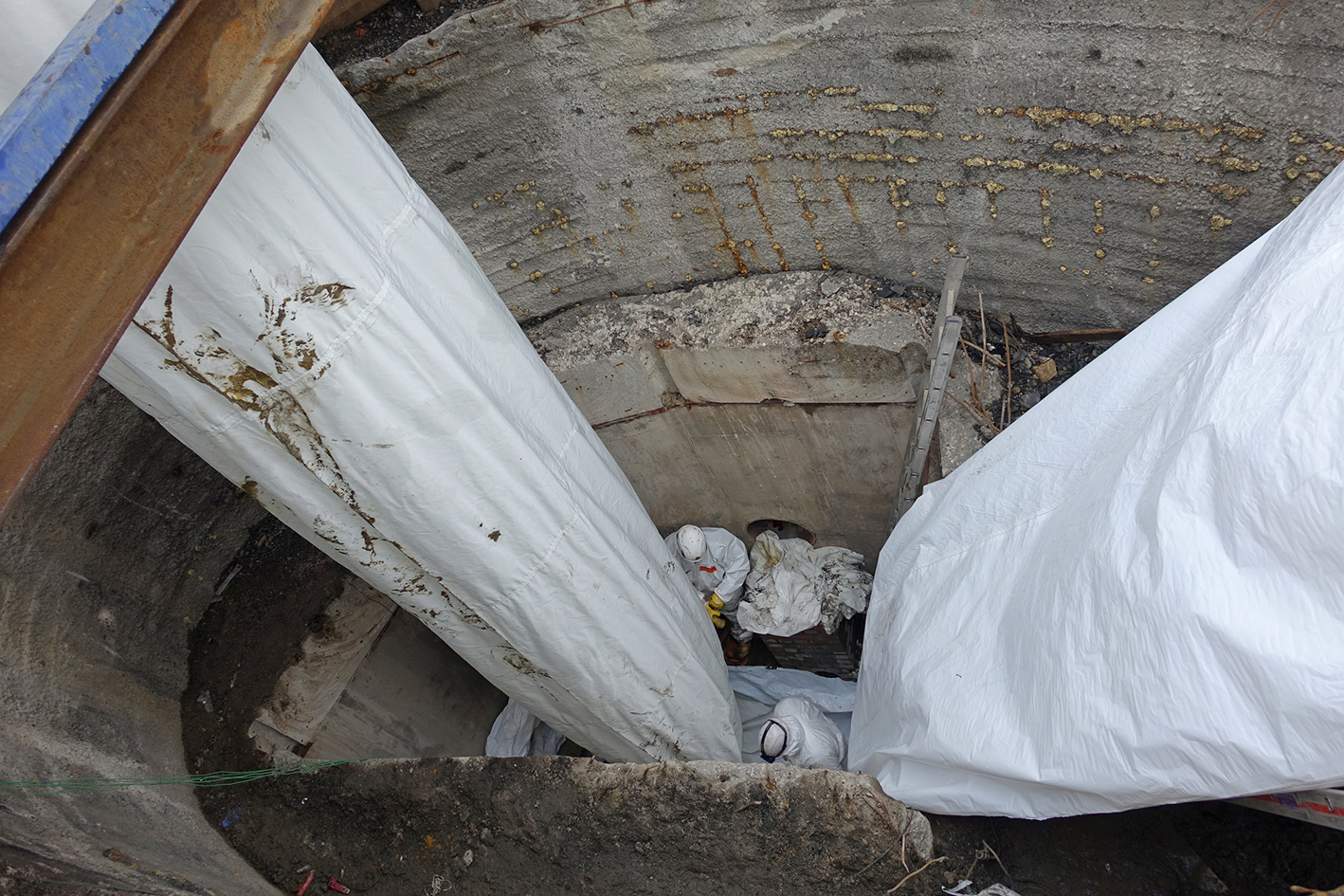 Bei der im Dezember 2020 durchgeführten Sanierung der zweiten, etwa 150 m langen Haltung, wurde der Inversionsturm in einer Baugrube installiert, über den der Zugang zum Hauptsammler erfolgen sollte. Die Baugrube war notwendig, da der Schlauchliner aufgrund der Kanaldimension nicht über den vorhandenen Einsteigschacht in den Hauptsammler invertiert werden konnte.