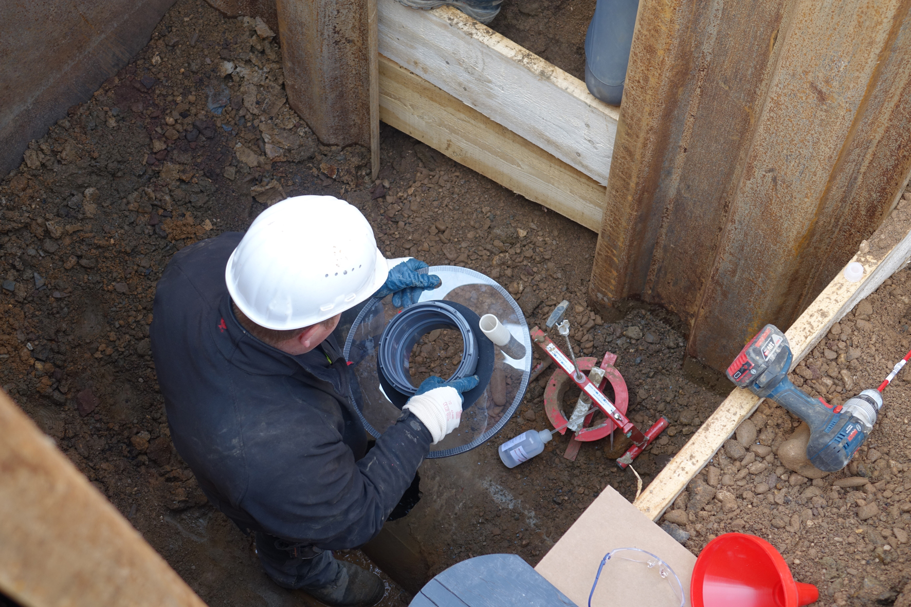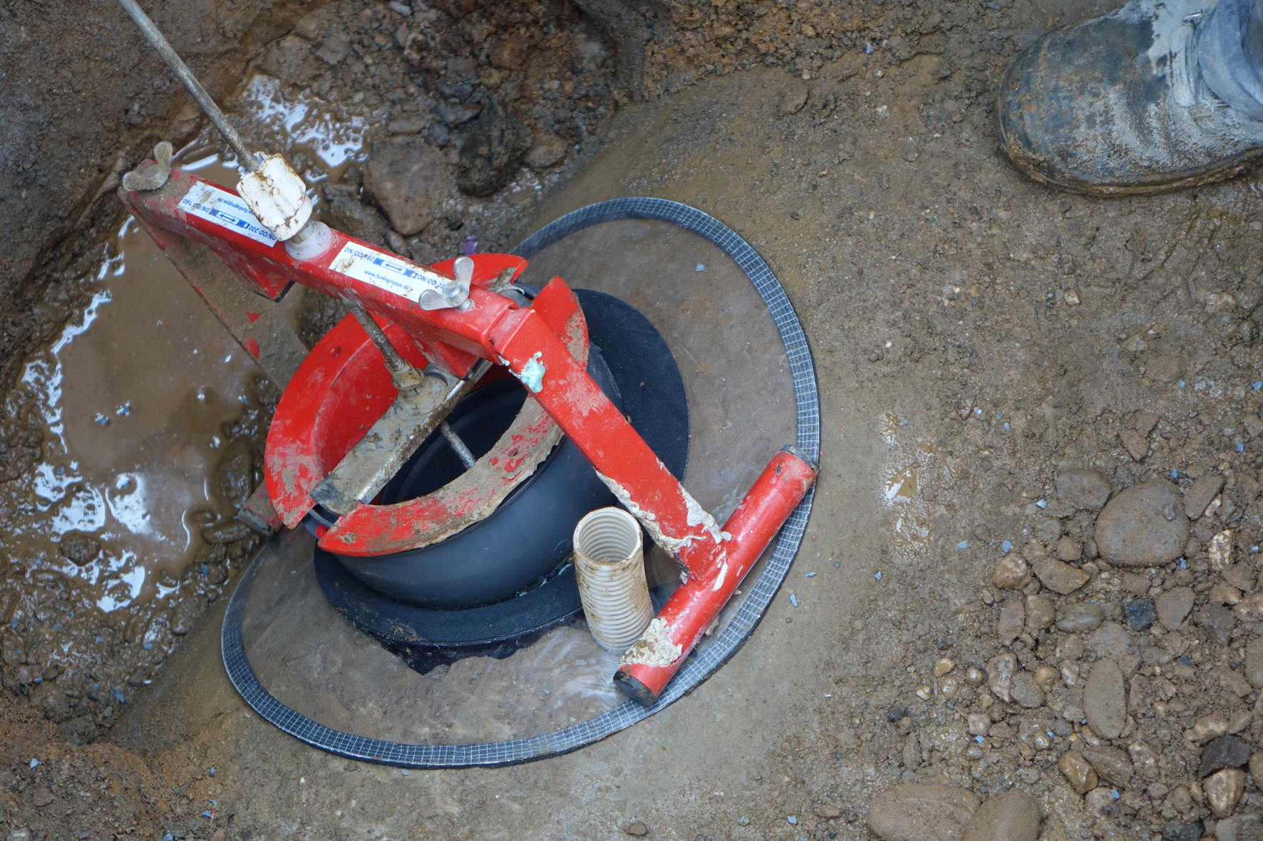 Danach wird die Öffnung von außen mit der transparenten Außenverschalung abgedeckt und, ebenfalls unter Nutzung der Gewindestange, der Sanierungsstutzen eingesetzt. Zum Schluss wird über die Gewindestange ein Metallbügel auf dem Sanierungsstutzen angedreht und die gesamte Konstruktion mit einem Schraubenschlüssel festgezogen – die Innenverschalung legt sich kraftschlüssig an die Rohrinnenwandung an. Für zuverlässige Dichtheit sorgt ein spezielles, innerhalb von zwei Stunden aushärtendes Vergussharz, das über einen Schlauch und einen Trichter eingebracht wird. Die transparente Außenverschalung gestattet dabei eine Sichtkontrolle und hilft so eine gleichmäßige Verteilung des Harzes sicherzustellen.