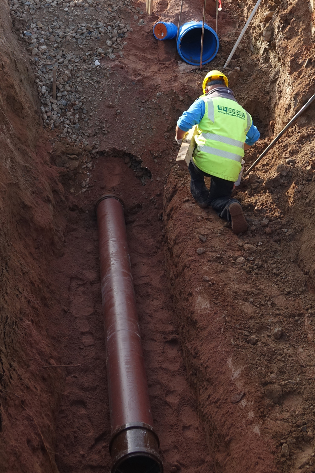Nach den Vorarbeiten begann im Juni 2017 die Verlegung der HS®-Kanalrohre (12 kN/m2 nach ISO 9969), die zur besseren Unterscheidung verschieden eingefärbt sind; auf diese Weise sind die blauen Regen- und braunen Schmutzwasserrohre auch noch nach vielen Jahren eindeutig von einander zu unterscheiden. Die Rohre aus PVC-U wurden speziell für Tiefbauaufgaben entwickelt, bei denen es auf eine hohe Ring- und Längsbiegesteifigkeit ankommt.