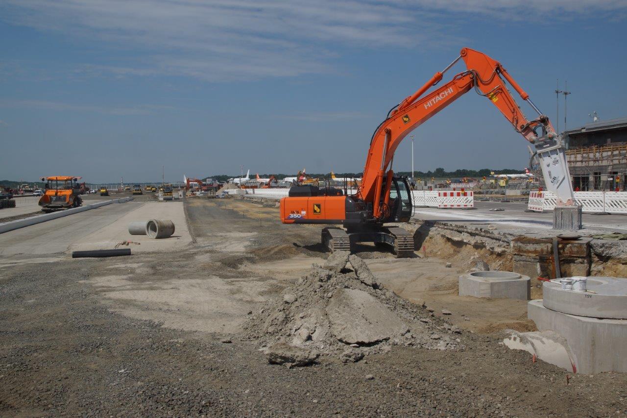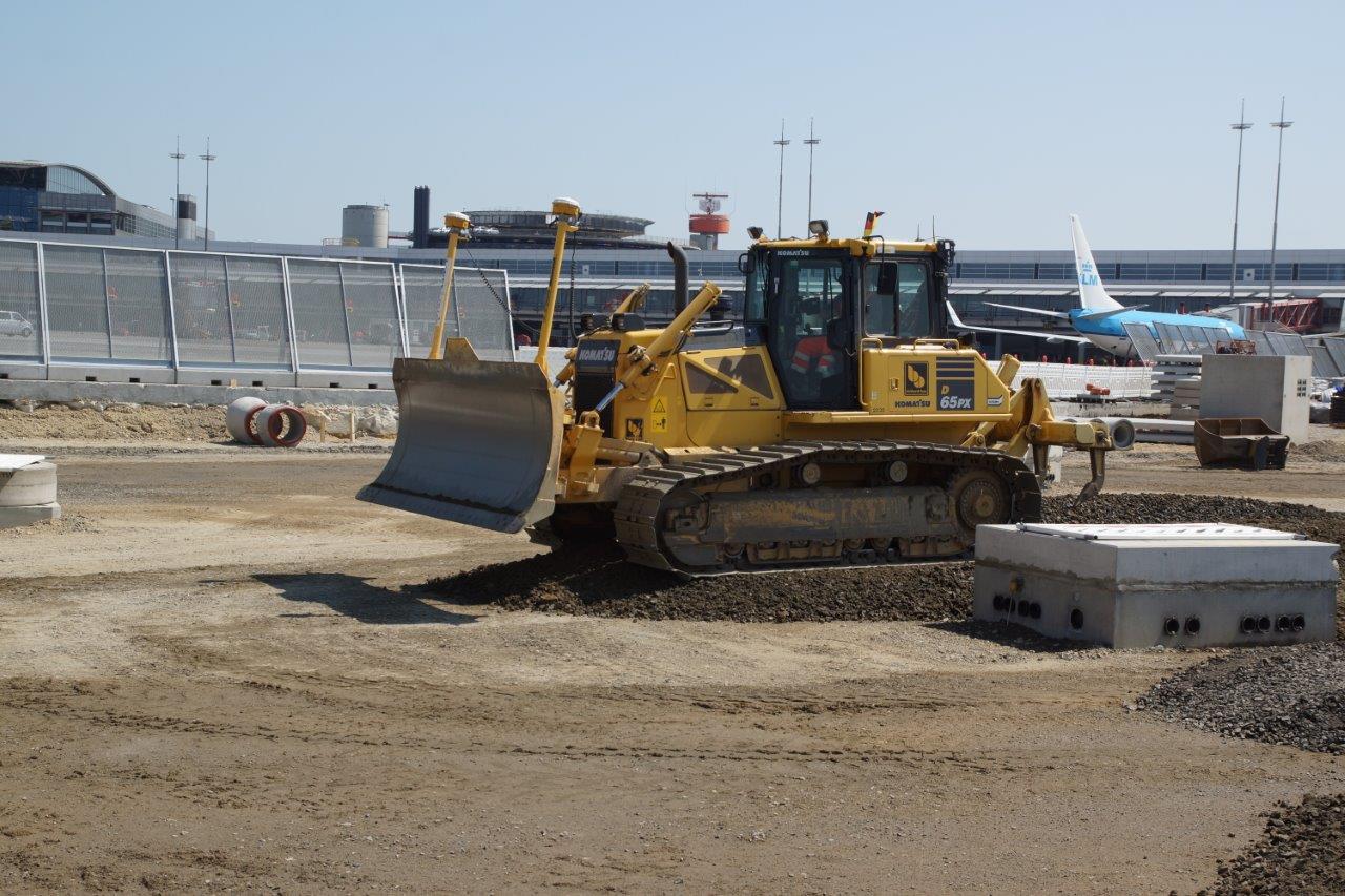 Seit März 2016 laufen die Bauarbeiten am Vorfeld 1. Da nicht nur die Betonoberflächen des Vorfeldes schadhaft waren, sondern flächendeckend auch die gesamte Regenwasserkanalisation, entschied sich der Bauherr dafür, die vorhandenen Anlagen komplett auszutauschen. Im Rahmen der Grundinstandsetzung entstehen 27 Positionen im Pierbereich und 15 Positionen auf den zwei Remoteinseln. Die Anforderungen an die Entwässerung und die zu verwendenden Materialien waren dabei entsprechend hoch.