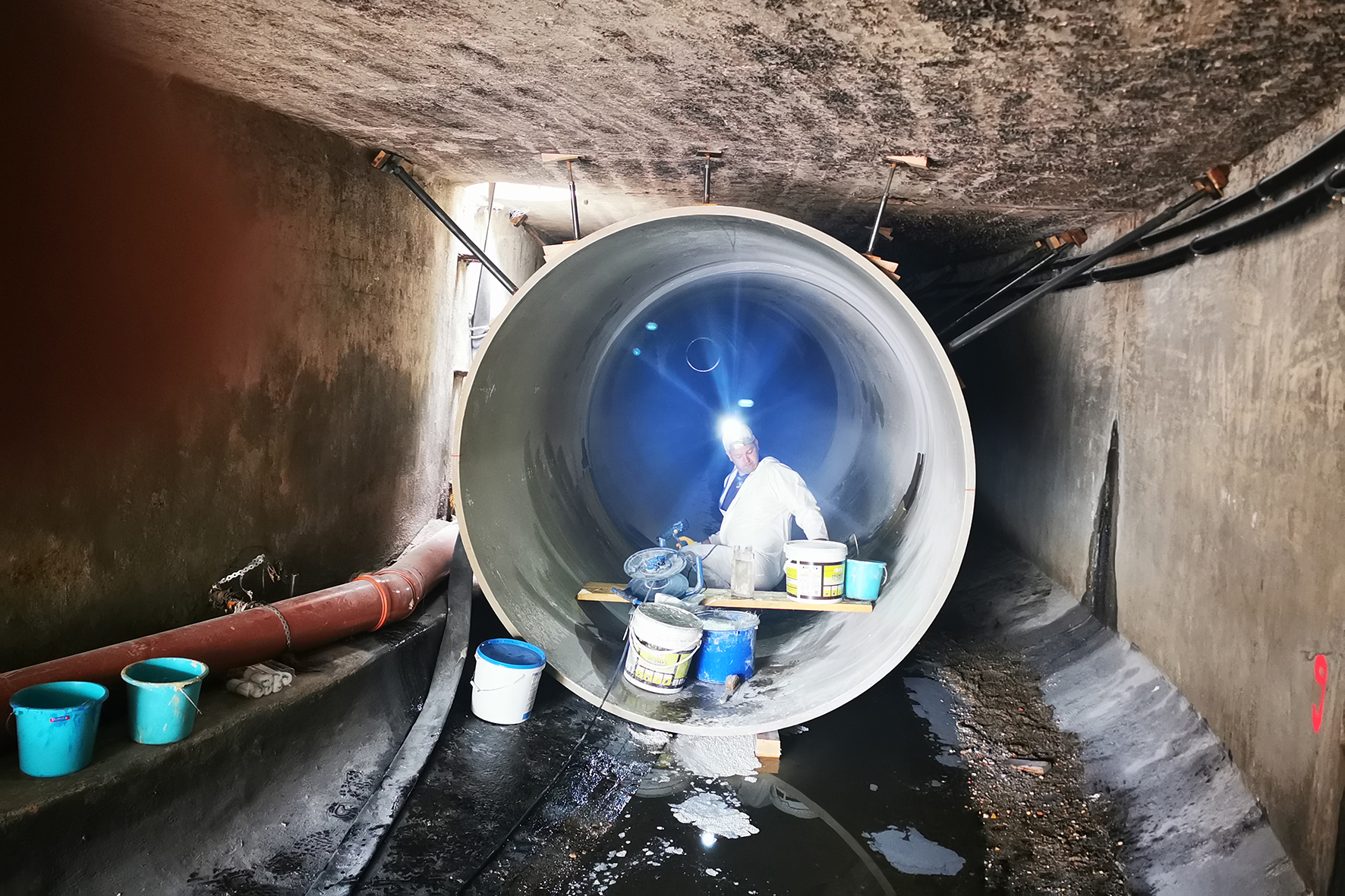 Zusammen mit Amiblu konnte die Aufgabe jedoch zur Zufriedenheit aller gemeistert werden. Dabei kamen auf einer Länge von 100 m kreisrunde GFK-Rohre von Amiblu der Nennweite DN 2200 zum Einsatz, die Aarsleff per Relining in den Pontekanal aus dem 19. Jahrhundert einbaute. In offener Bauweise verlegte die STRABAG auf 40 m Länge GFK-Maulprofile von Amiblu in der Größe 3200 x 2000 mm.