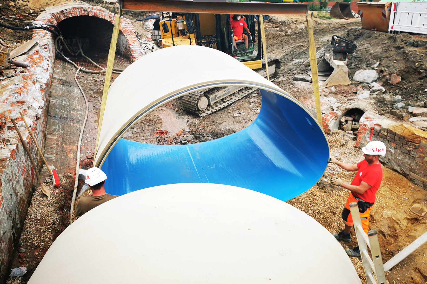 Das von der STRABAG in offener Bauweise verlegte GFK-Maulprofil ersetzt zwei parallel zueinander verlaufende, gemauerte Zulaufkanäle, die abgebrochen wurden. Die hierbei entstandene Abbruchstätte wiederum nutzte Aarsleff als Baugrube für das Einbringen der kreisrunden Profile in die andere Richtung. „Das war die wirtschaftlichste Lösung, auch wenn es für die Einbausituation nicht ideal war. Die Baugrube lag nämlich direkt an einer S-Kurve. Mit 3 Meter langen Rohren ist das etwas komplizierter“, beschreibt Bauleiter Thomas Tzschoppe von der Aarsleff Rohrsanierung die Herausforderungen vor Ort. Im Kurvenbereich setzten die Profis trapezförmige Rohre ein, die schräg geschnitten und dann zusammengefügt worden waren.
