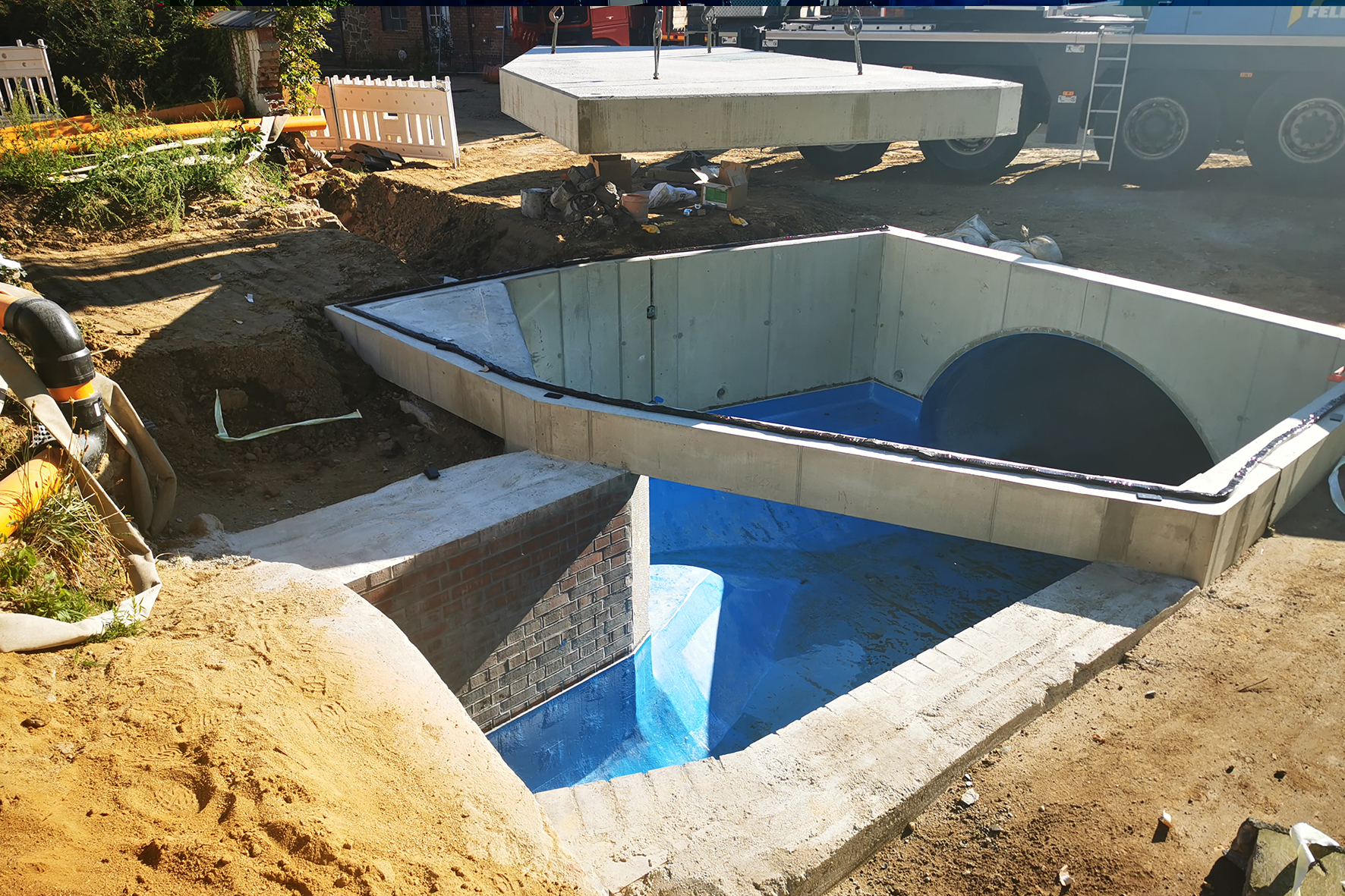 Dem schnellen Baufortschritt spielten aber nicht nur die gute Planung und die hervorragende Zusammenarbeit der ARGE, sondern auch das gute Wetter in die Karten: Im Pontekanal kommen Niederschläge aus einem 460 ha großen Einzugsgebiet zusammen. Bei stärkerem Regen mussten die Kanalarbeiten zwangsläufig ruhen – was nur an wenigen Tagen der Fall war. Für die übrige Zeit hatten Aarsleff und STRABAG eine „Mini-Wasserhaltung“ mit 50 l/sec eingerichtet.