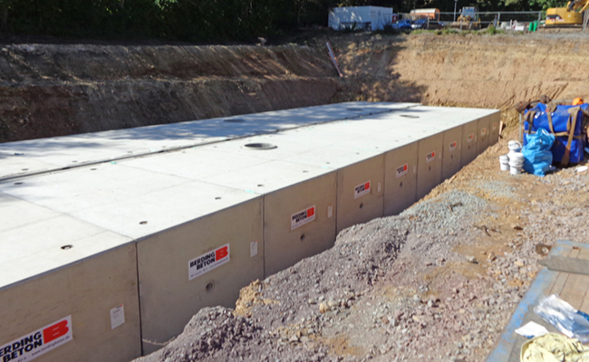 Das anfallende Regenwasser wird über das örtliche Kanalnetz abgeleitet. Um dieses bei Starkregen nicht zu überlasten, war der Bau einer – dem Kanalnetz vorgeschalteten – Retensionsanlage erforderlich. Der Bauherr entschied sich für eine geschlossene Bauweise in Form eines Stauraumkanals aus Fertigteilen. Die Unterhaltungskosten im Gesamtzeitraum der Nutzung und die gegebenen Platzverhältnisse waren für diese Entscheidung ausschlaggebend.