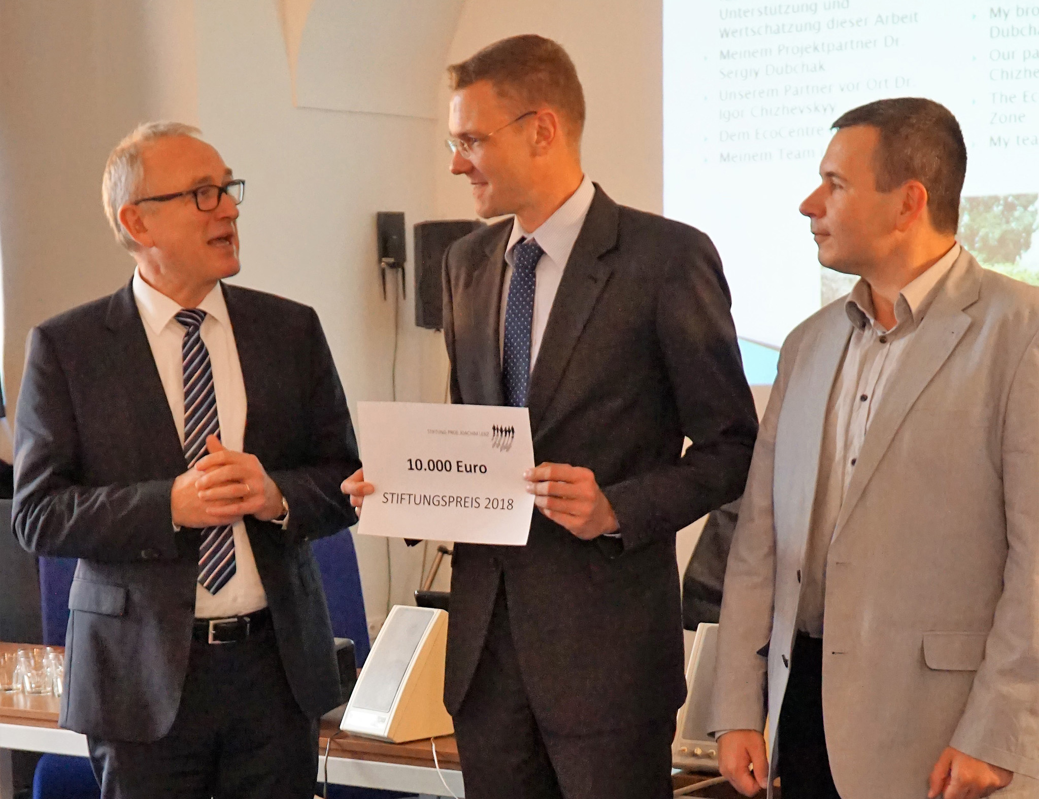 Der alle drei Jahre ausgeschriebenen Stiftungspreis in Höhe von 10.000 Euro ging in diesem Jahr an Prof. Dr. Georg Steinhauser, Leibniz Universität Hannover, und Dr. Sergiy Dubchak, State Ecological Academy of Postgraduate Education and Management, Ukraine.