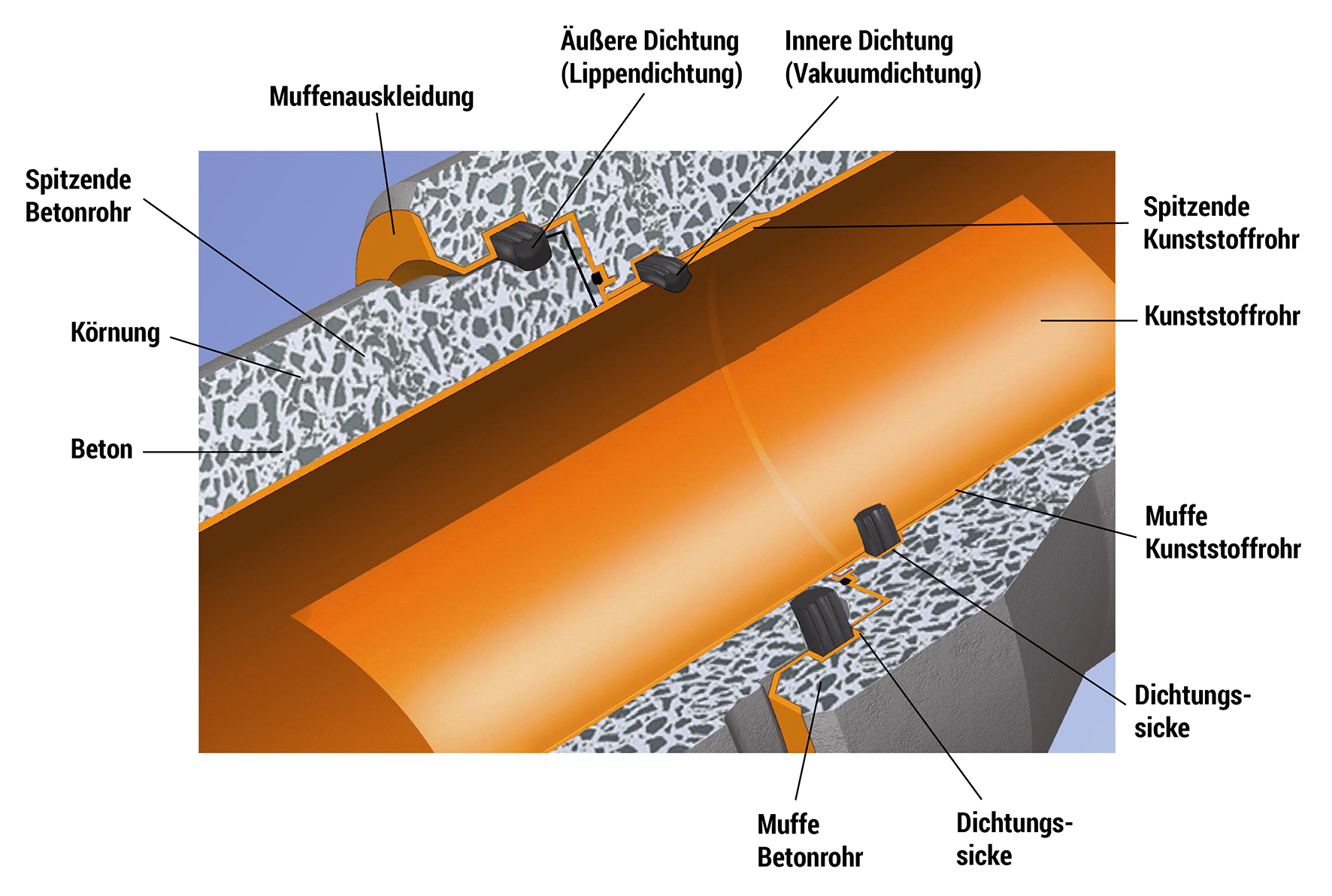 Bei Rohren mit Muffenauskleidung sind beide Dichtungen in der Muffe integriert. Prüfungen unter extremen Bedingungen des Instituts für Unterirdische Infrastruktur (IKT) haben gezeigt, dass die FABEKUN-Kanalrohre und ihre Dichtungen sowohl unter vergrößerten Abwinkelungen als auch unter erhöhten Scherlasten deutlich länger dicht halten, als von der einschlägigen Norm gefordert.