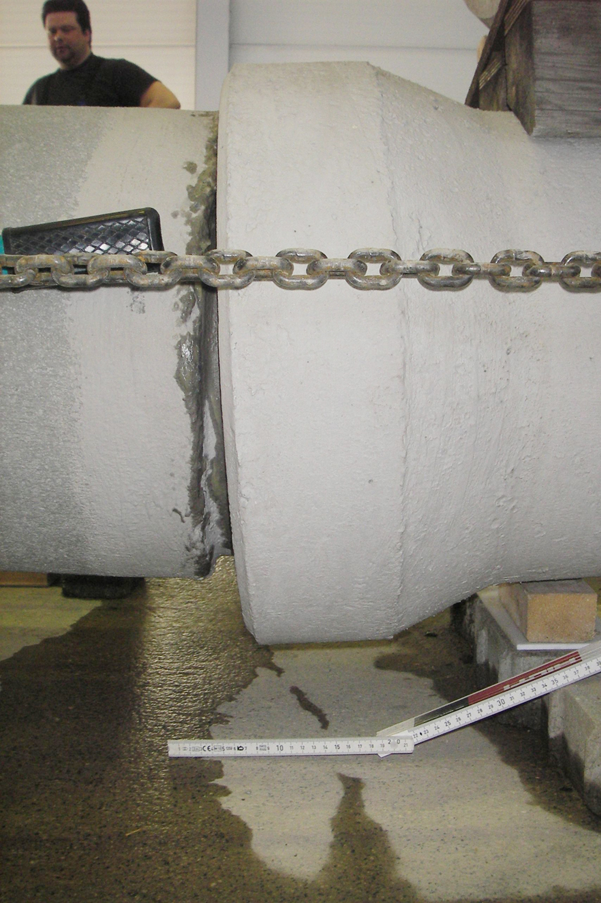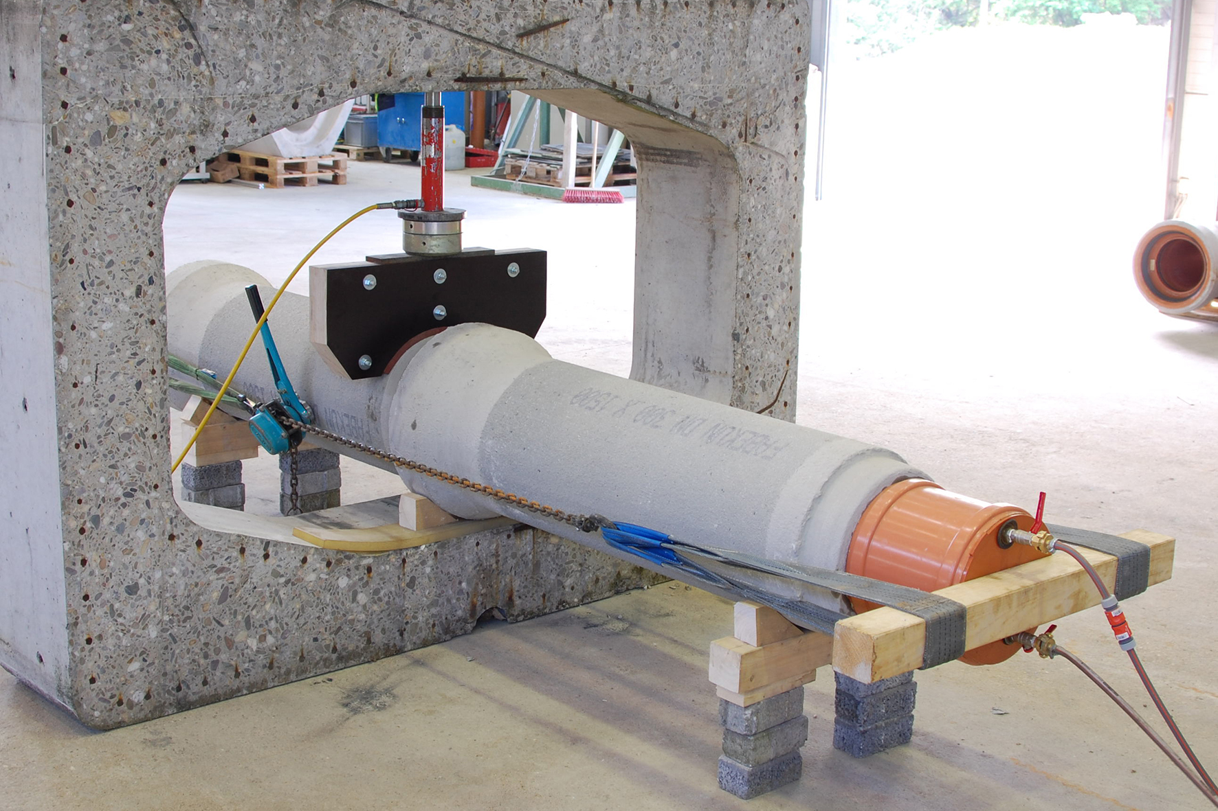 Für die Dichtigkeitsprüfung unter Scherlast (Foto 3) verlangt die Norm DIN EN 1916 (Rohre und Formstücke aus Beton, Stahlfaserbeton und Sichtbeton, Deutsche Fassung EN 1916:2002) eine Mindestbelastung von 9 Kilonewton. Die IKT-Prüfer erhöhten die Scherlast in der Rohrverbindung zunächst auf 15 Kilonewton und dann weiter um jeweils 5 Kilonewton. Dabei betrug der Druck in der Rohrleitung 1 bar, was dem Druck einer 10 Meter hohen Wassersäule entspricht. Erst bei einer Scherlast von 30 Kilonewton versagten die Rohre und übertrafen damit die Mindestanforderung der Norm um das 3,3-fache.