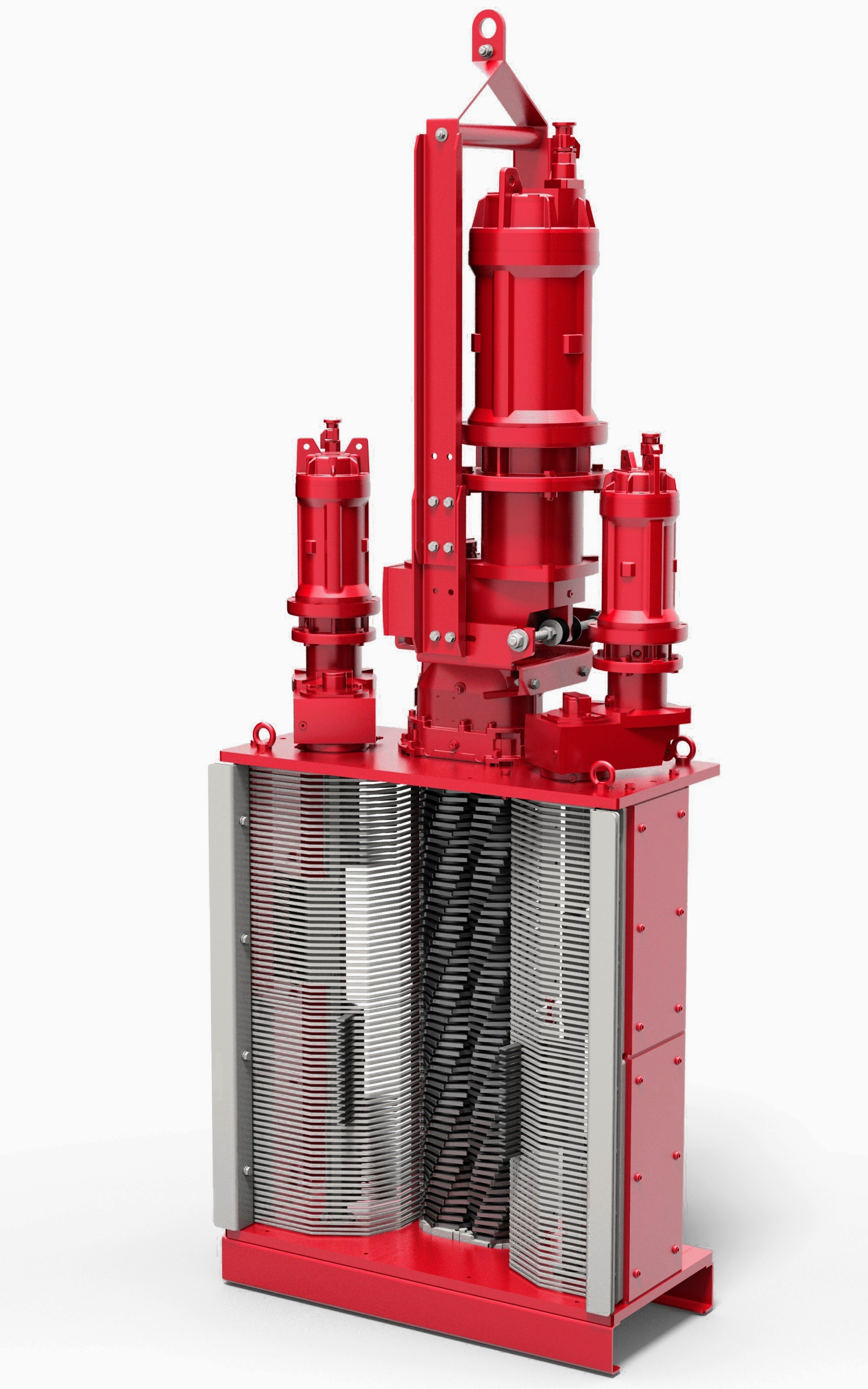 Der XRipper Giant (XRG) ist eigens für sehr hohe Durchflussmengen in großen Kanälen konzipiert. Er zerkleinert problemlos Störstoffe im Abwasser bei Durchflussraten von bis zu 3.000 m3/h. Der Zweiwellen-Zerkleinerer basiert auf dem bewährten XRipper Channel (XRC) und wurde um seitliche High Capacity Units erweitert. Diese bestehen aus jeweils einem Sieb sowie langsam und dadurch energieeffizient laufenden Freiräumern. Störstoffe werden vom Sieb aufgehalten und von den Freiräumern kontinuierlich in die Mitte des Zerkleinerers gefördert.