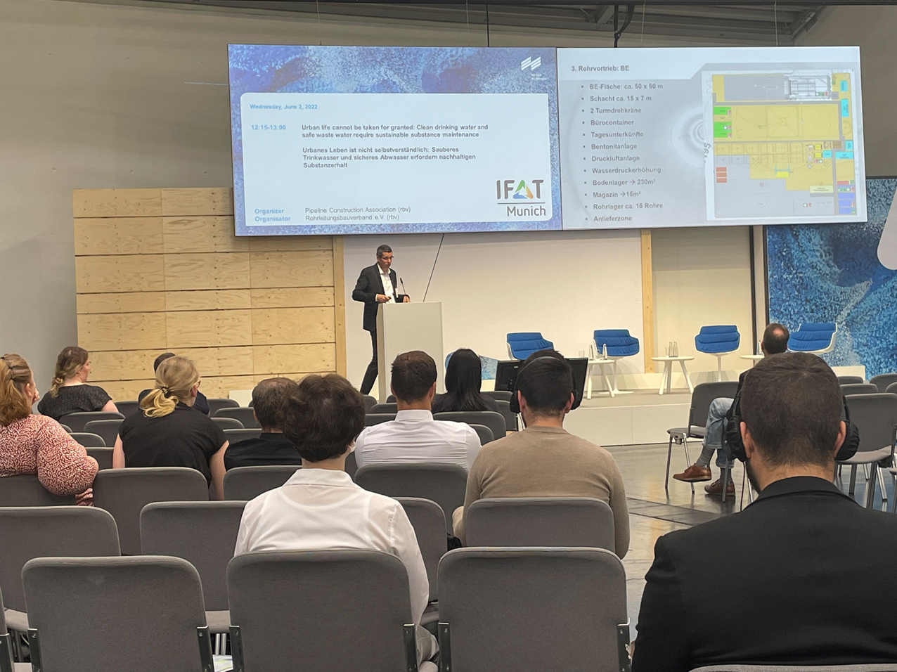 Umfassend, informativ, praxisorientiert – so das Motto des fachlichen Rahmenprogramms der IFAT 2022, in das auch der rbv hochkarätigen fachlichen Input eingebracht hat. Im Forum Wasser/Abwasser referierten rbv-Vertreter, darunter rbv-Referent Andreas Hüttemann, an zwei aufeinanderfolgenden Tagen über den Substanzerhalt leitungsgebundener Ver- und Entsorgungssysteme, über Qualität und Sicherheit beim Rohrvortrieb, über Stauraumkanäle im Kontext urbaner Sturzfluten sowie über die Digitalisierung im Leitungsbau. Auch hier trat erneut der hohe Wissensfundus der Branche zutage und ihre Problemlösungskompetenz für die vielen mit baulichen Mitteln zu adressierenden gesellschaftlichen Aufgabenstellungen unserer Zeit.