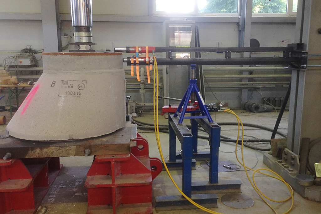 Mit den Versuchen wurden zwei Lastkonstellationen untersucht: zunächst eine vertikale Verkehrsbelastung in Verbindung mit der zugehörigen horizontalen Bremslast auf der Abdeckung. Anschließend wurde eine reine Horizontalbelastung am ersten Bauteil über dem Konus beziehungsweise über dem Adapterring zur Ermittlung der maximalen Belastbarkeit der Verschiebesicherung aufgebracht.